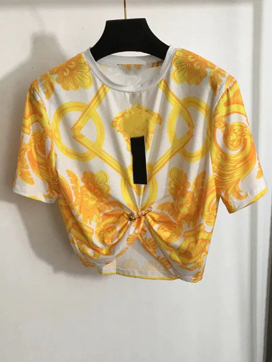 Retro printing irregular pin pleated short T-shirt 2025 summer women's two-piece suit+high waist loose skirt fashion suit