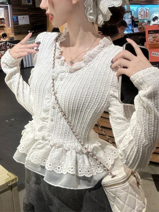 New Sweet clothes Gentle Lace V-neck Shirt Female New Japanese Fashion Slim Elegant Shirt Spring 2025 Harajuku Long Sleeve Solid Clothes