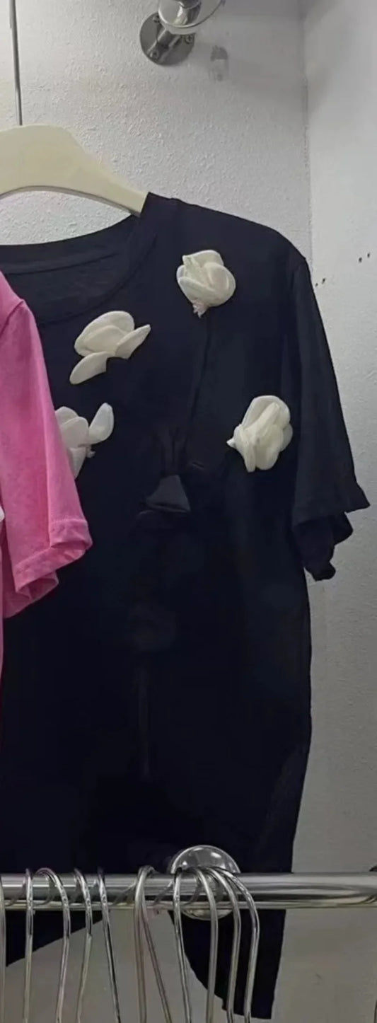 Beads Women clothes Tops Contrast 3d Flower Camisetas O-Neck Short Sleeve Ropa Mujer Loose Casual T Shirt Summer 2025 New Clothes