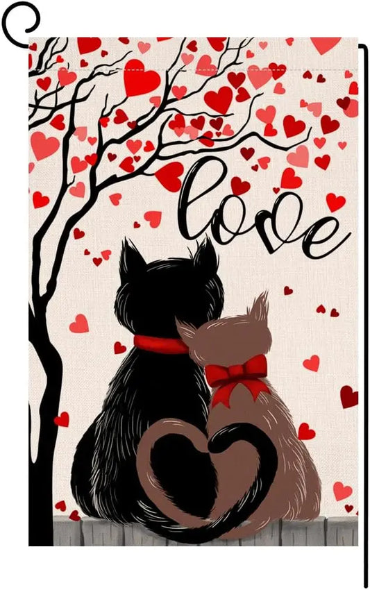 BLKWHT Valentines Cats Garden Flag 12x18 Vertical Double Sided Red Love Tree Spring Farmhouse Holiday Outside Decorations Burlap