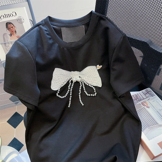 Beads Bow Ropa Mujer Round Neck Short Sleve Clothes Contrast Women Clothing Sweet Embroidery Tops Summer 2025 New Camisetas