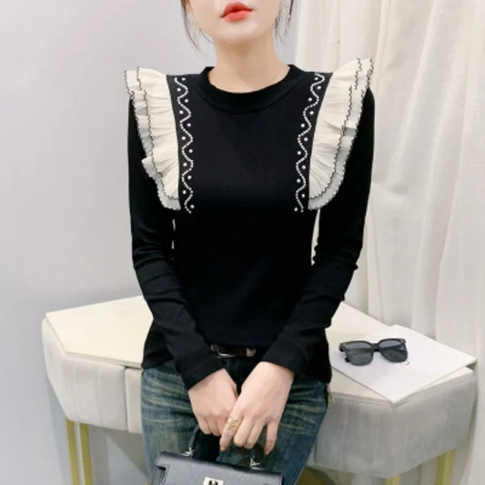 2025 New European Clothes Women Cotton T-shirt Chic O-Neck Patchwork Ruffles Diamonds Beading Tops Spring Long Sleeve Tees