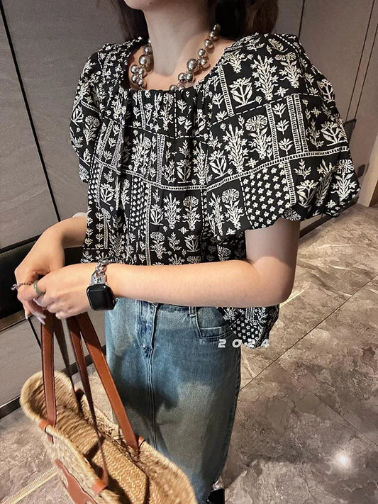 Square Neck Puff Sleeve Patterned Off-shoulder Cropped Women's Top 2024 Spring/Summer Vacation Blouse Petite Women's Clothing clothes