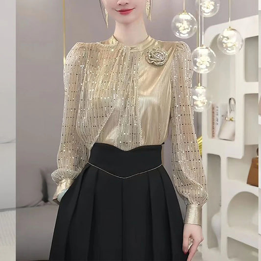 Women's Stylish Luxury Sequins 3D Flower Designer Blouse Office Lady Elegant Business Casual Shirts O Neck Long Sleeve Slim Tops clothes