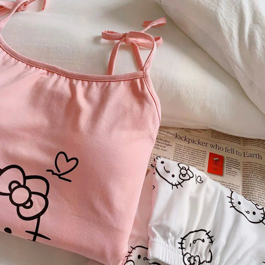 Hello Kitty Tank Nightgown Women Trunks 2pcs Pajama Set Kawaii Girl Summer with Bra Pads Comforts Loungewear Clothing Gift clothes
