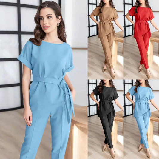 Women's Summer New Fashion Casual Round Neck Beveled Edge Suit Belt Top Set of Petite Pants Elegant Style Office Lady Suit Sets clothes