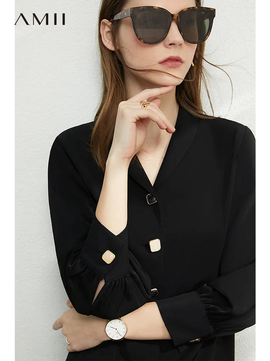 Amii Minimalism Blouse Women Spring Vneck Solid Chiffon Blouse Office Lady Casual Shirts Elegant Blusas Female Tops 12030219 clothes