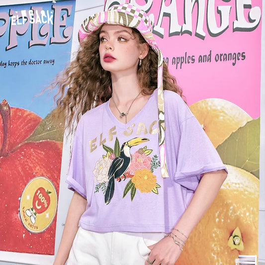 ELFSACK 2024 summer new arrival V-neck shiny letter print casual petite short-sleeved T-shirt for women clothes