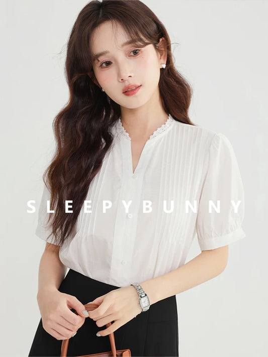 White Lantern Sleeve Blouse Women Spring Fall French V-Neck Long Sleeve Elegant Petite Office Shirt Stylish Casual Chic Top clothes
