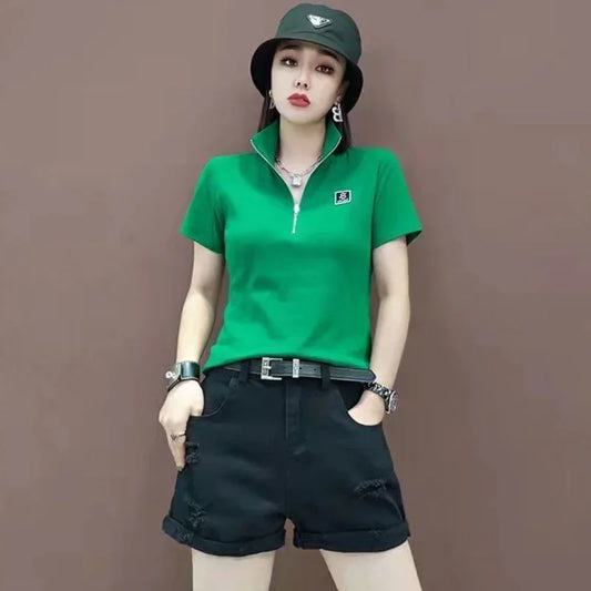 T-shirt Woman Short Sleeve Tee Clothing Green Polo Neck Shirts for Women Tops White Korean Style Polyester Luxury High Quality V clothes