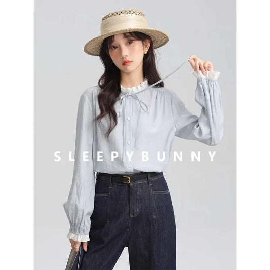 Spring Women Blue Ruffle Trim Long Sleeve Shirt French Vintage Style Loose Fit Blouse Elegant and Chic Top for Petite Frames clothes