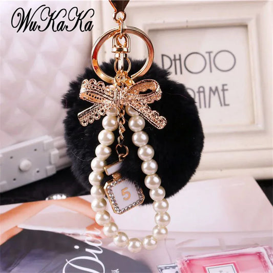 Car Women handBag Key Chain Fashion Pearl Chain Crystal Bottle Bow Pompom Keychain Fluffy Puff Ball Keychains Jewelry