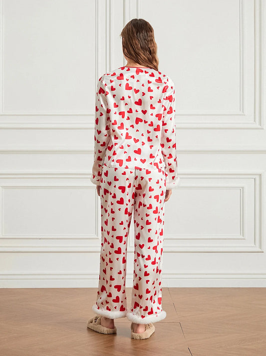 Women s Valentine s Day Lounge Set Long Sleeve Button Up Heart Print Tops Pants Sleepwear Sets