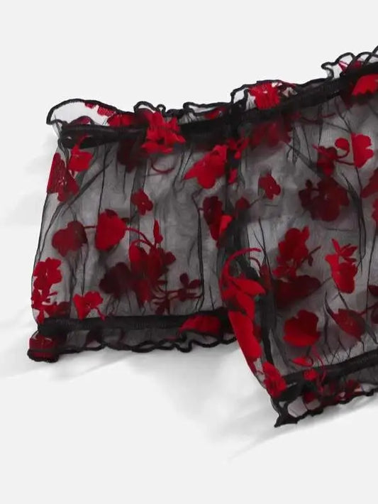 Plus Floral Pattern Sheer Mesh Lingerie Set & Choker