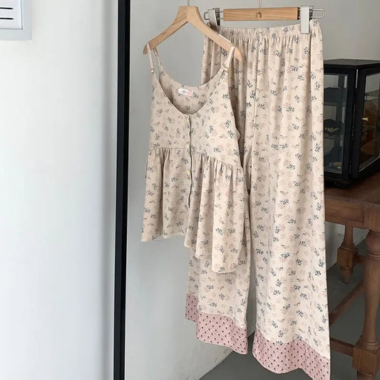 Summer Floral Pajama Sets Women Home Prairie Chic Sleeveless Girlish Sleepwear Thin Casual Students Dormitory Lounge Clothing