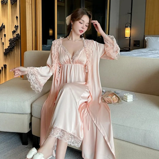 2PCS Bathrobe Gown Set Summer Satin Nightgown Women Nighty&robe Suit Lace Nightdress Loungewear Kimono Sleepwear Lady