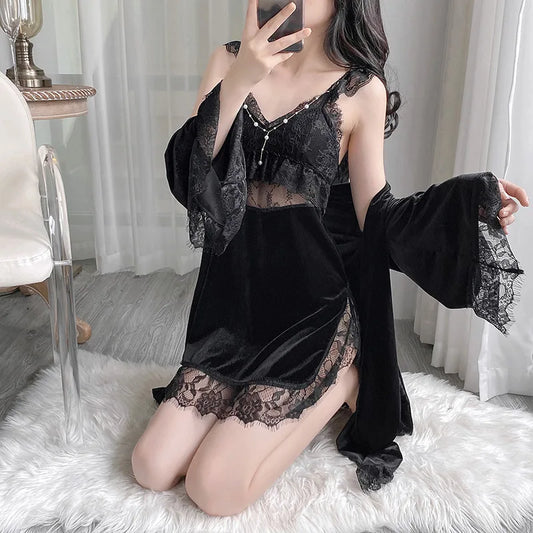 Black Lace Robe Suit Women 2PC Velour Bathrobe Gown Nightgown Set Nightdress Lingerie Autumn Velvet Kimono Sleepwear Loungewear