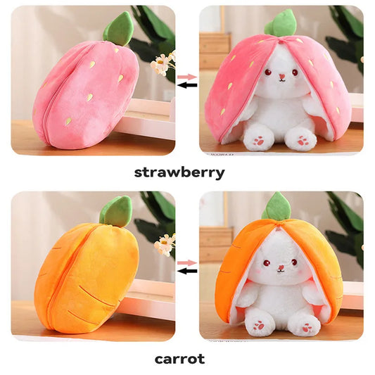 25 cm Cosplay Erdbeer-Karotten-Kaninchen-Plüschtier Ausgestopfte kreative Tasche in Obst verwandeln Baby Kuschelhase Plüschpuppe für Kinder