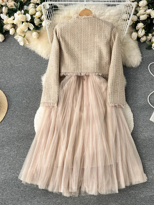 Damen Khaki Zweiteiler Vintage Luxus Kleid mit Langarm Jacke Mäntel Vintage Y2k Kleid Sets Outfits 2000er Kleidung 2024