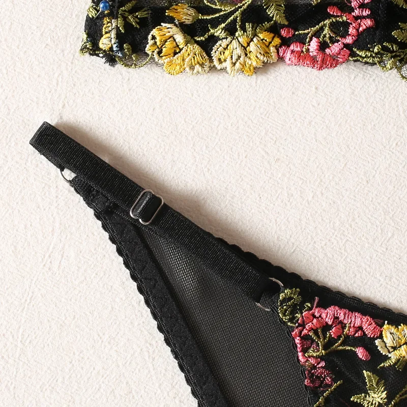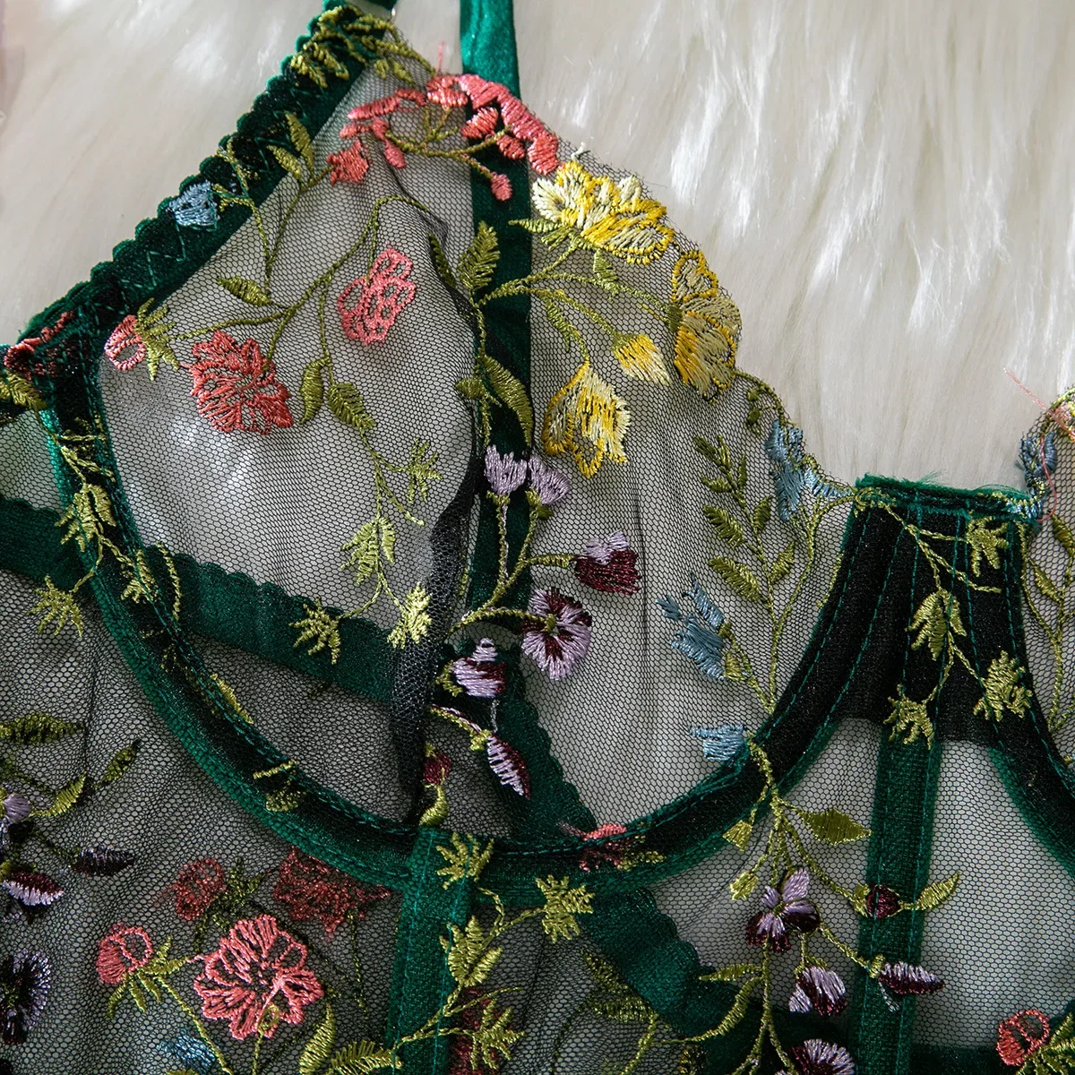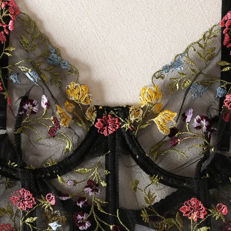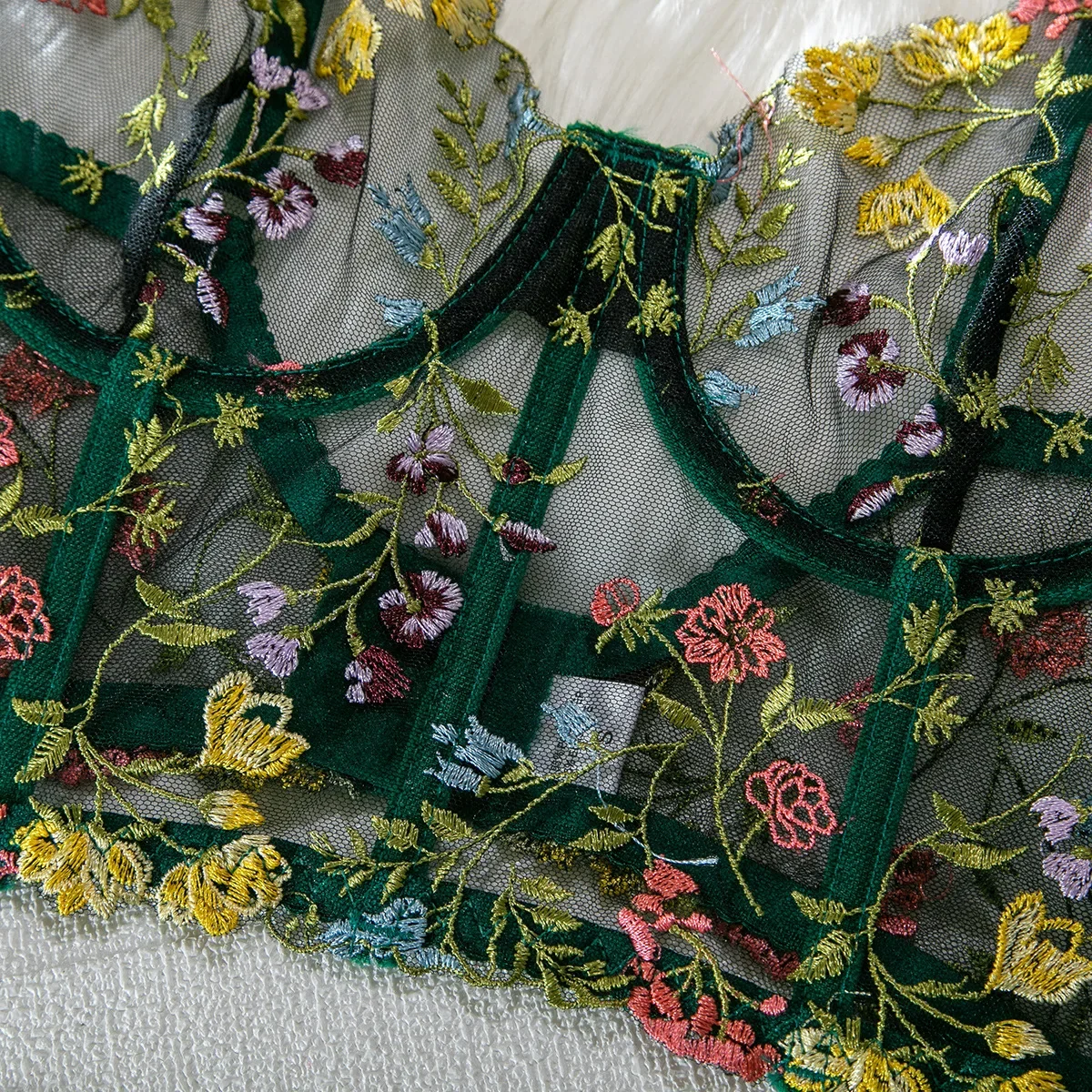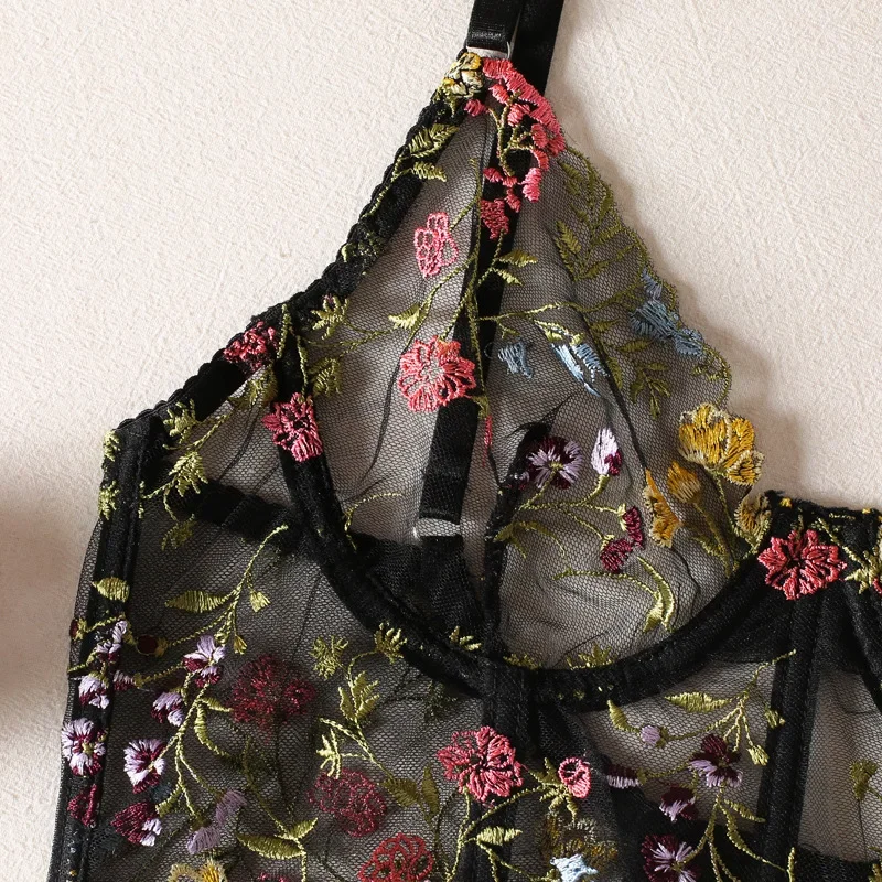 2024 Floral Embroidery Exotic Apparel Suit with Fishbone Steel Ring Women Solid Tank Top Strap Bra Triangle Panty Underwear Set