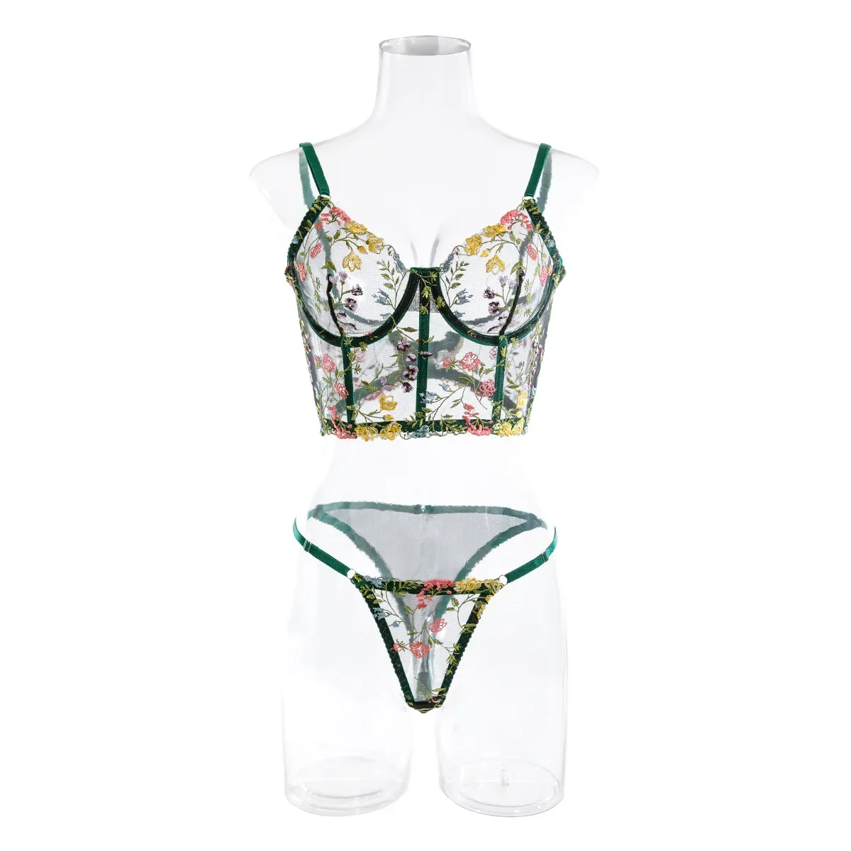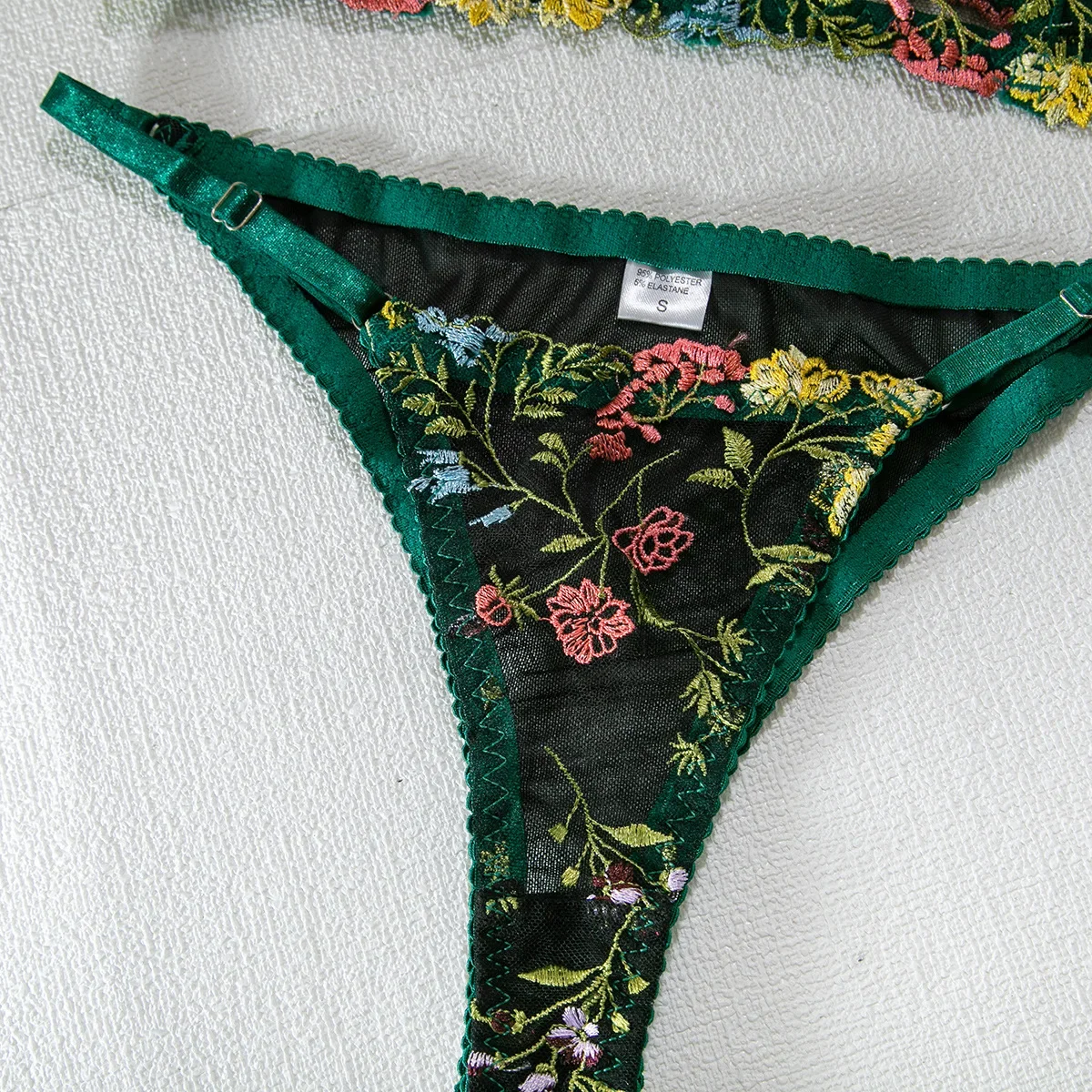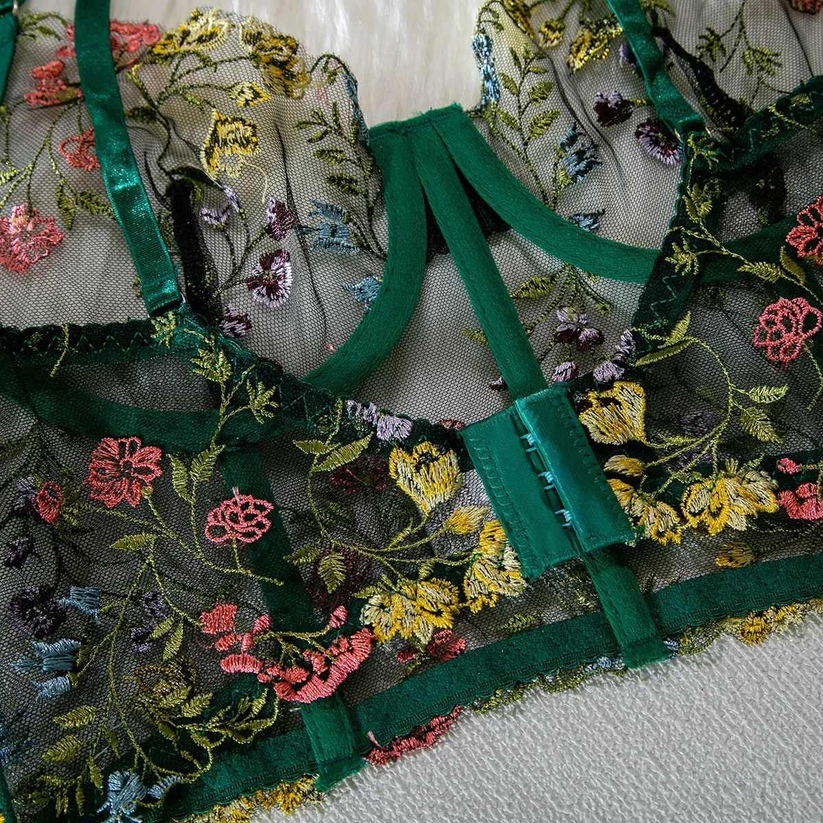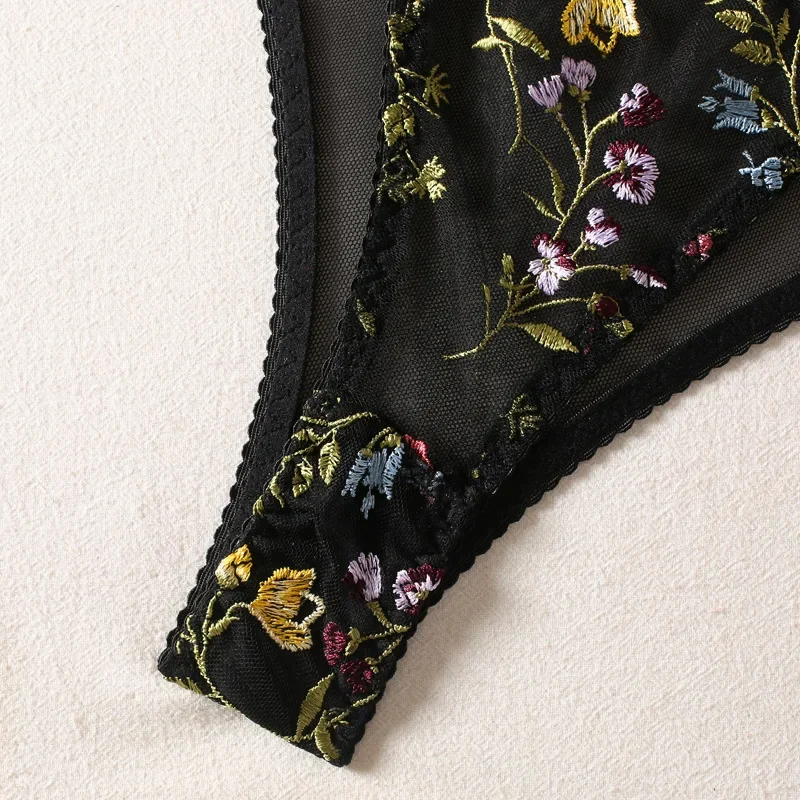 2024 Floral Embroidery Exotic Apparel Suit with Fishbone Steel Ring Women Solid Tank Top Strap Bra Triangle Panty Underwear Set