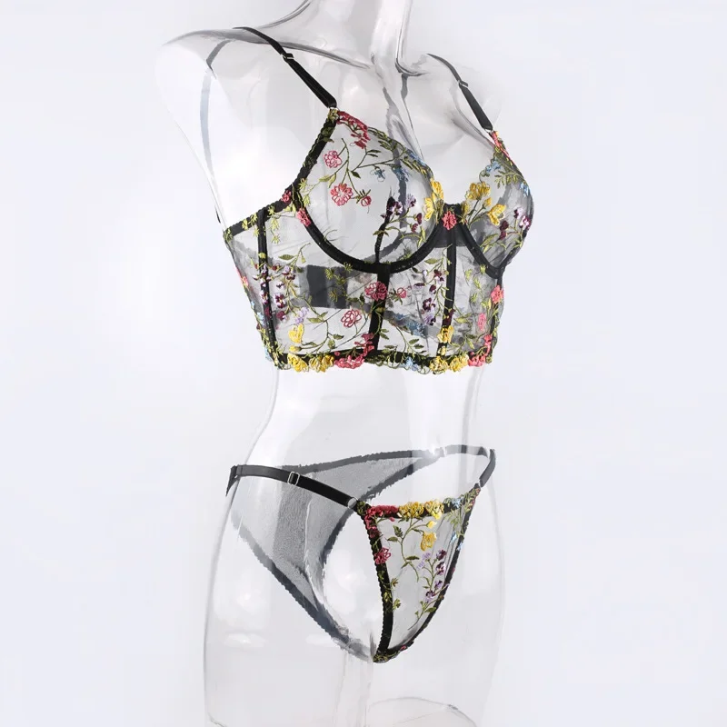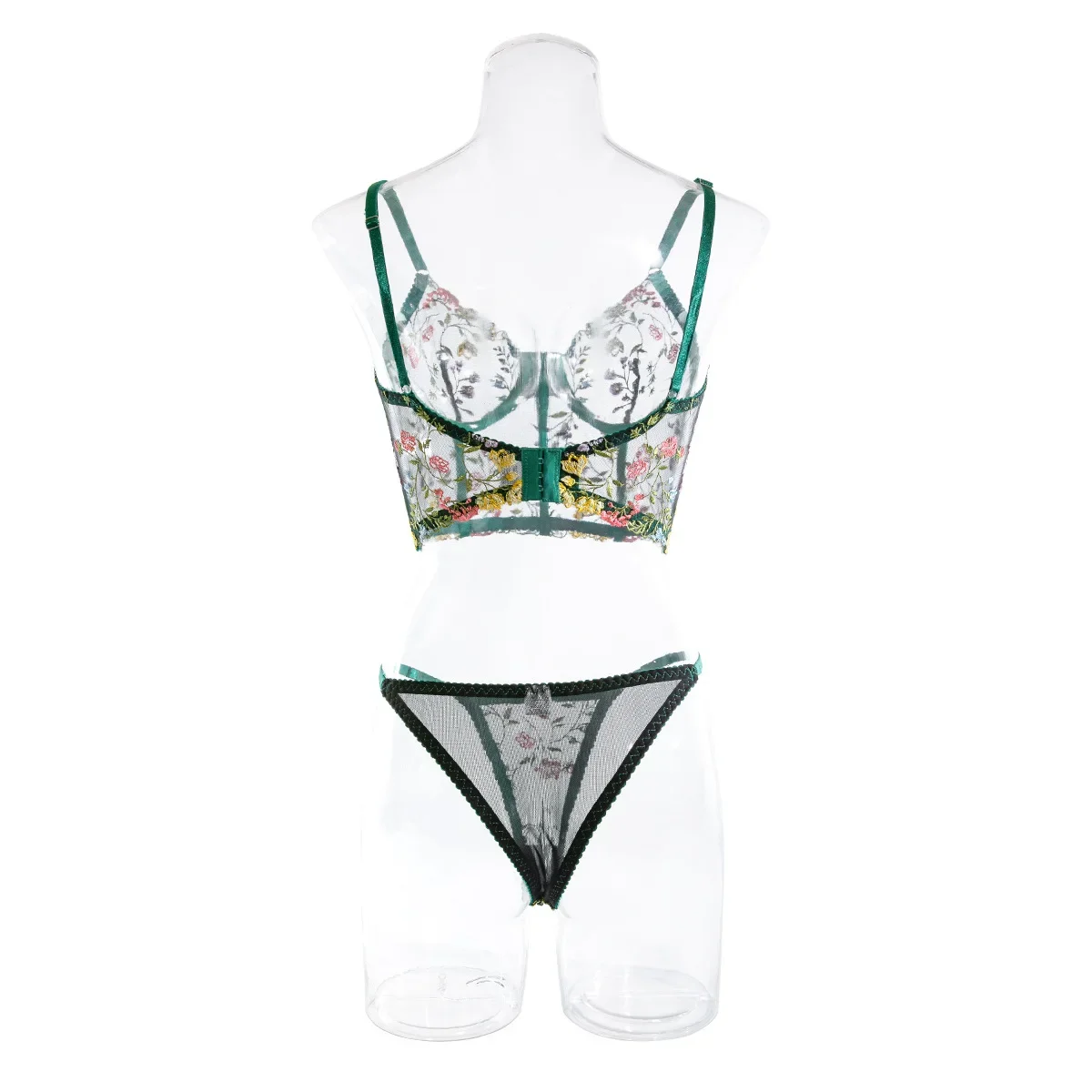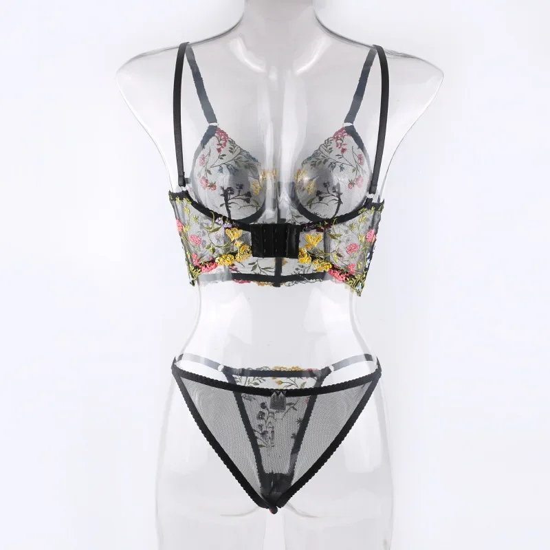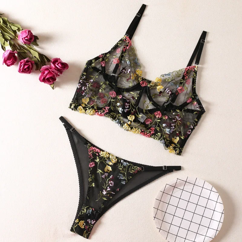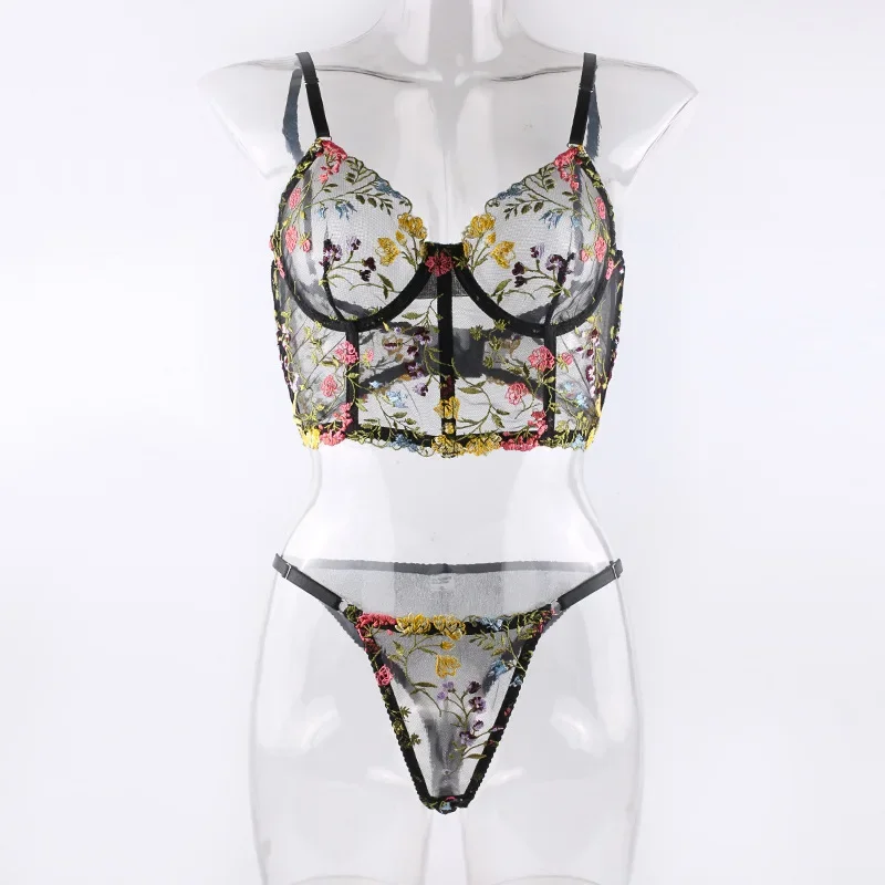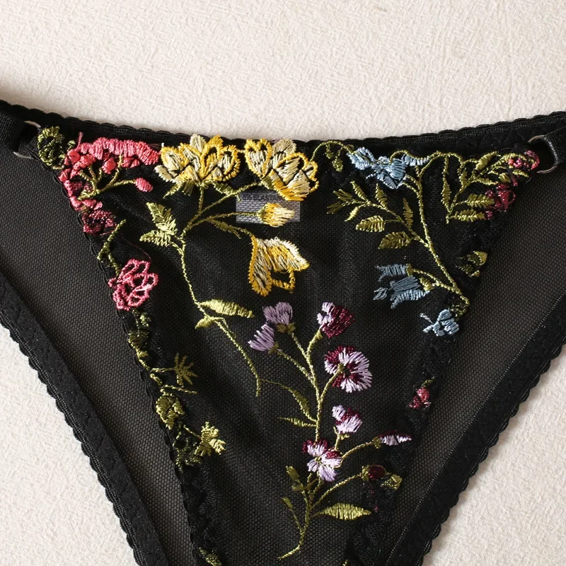 2024 Floral Embroidery Exotic Apparel Suit with Fishbone Steel Ring Women Solid Tank Top Strap Bra Triangle Panty Underwear Set