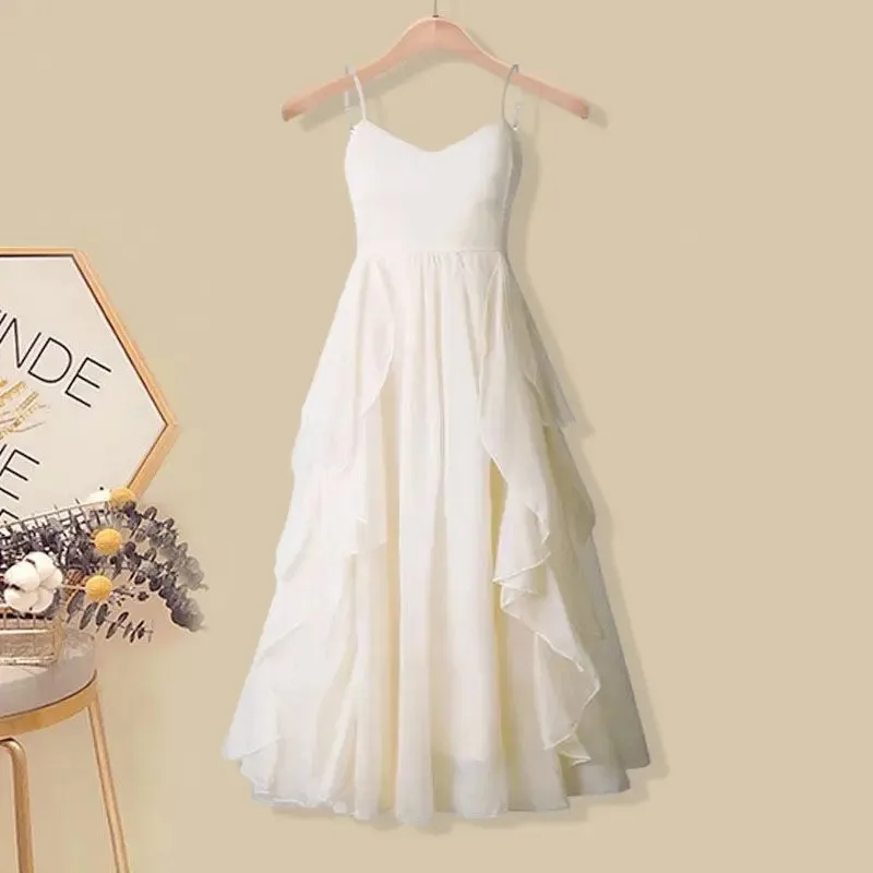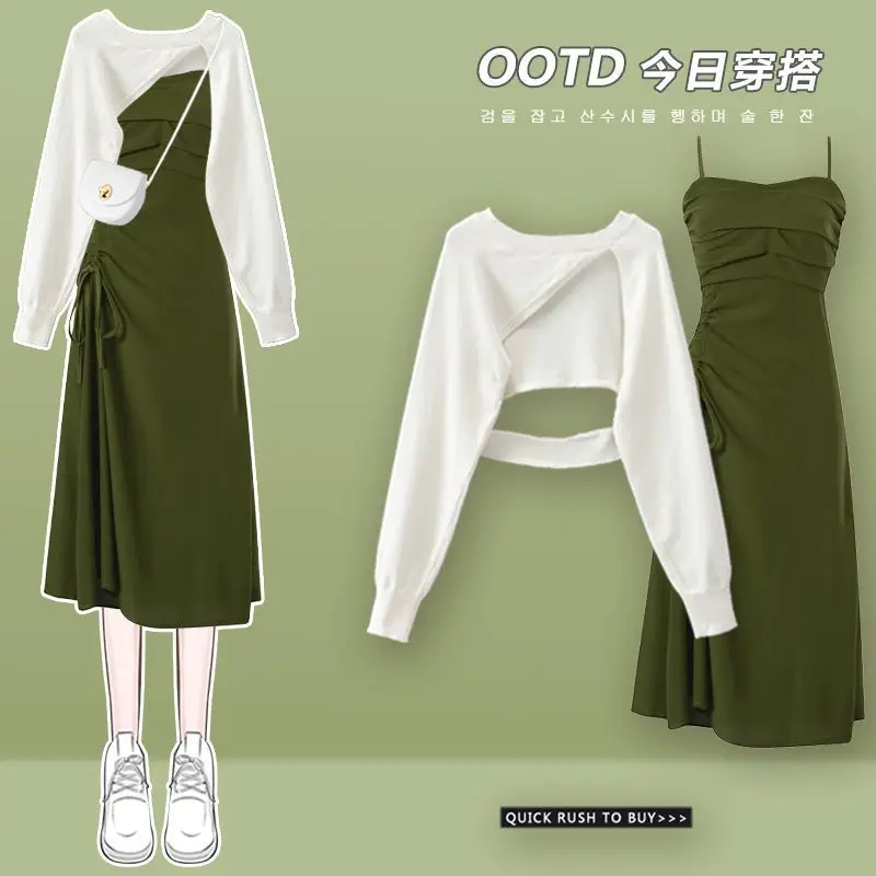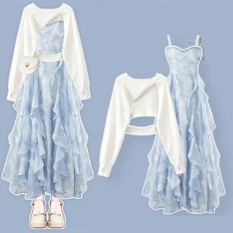 2024 Women's Autumn New Fashion Dress Matching Set Korean Elegant Short Irregular Long Sleeve Top+Strap Skirt Two Piece Suit