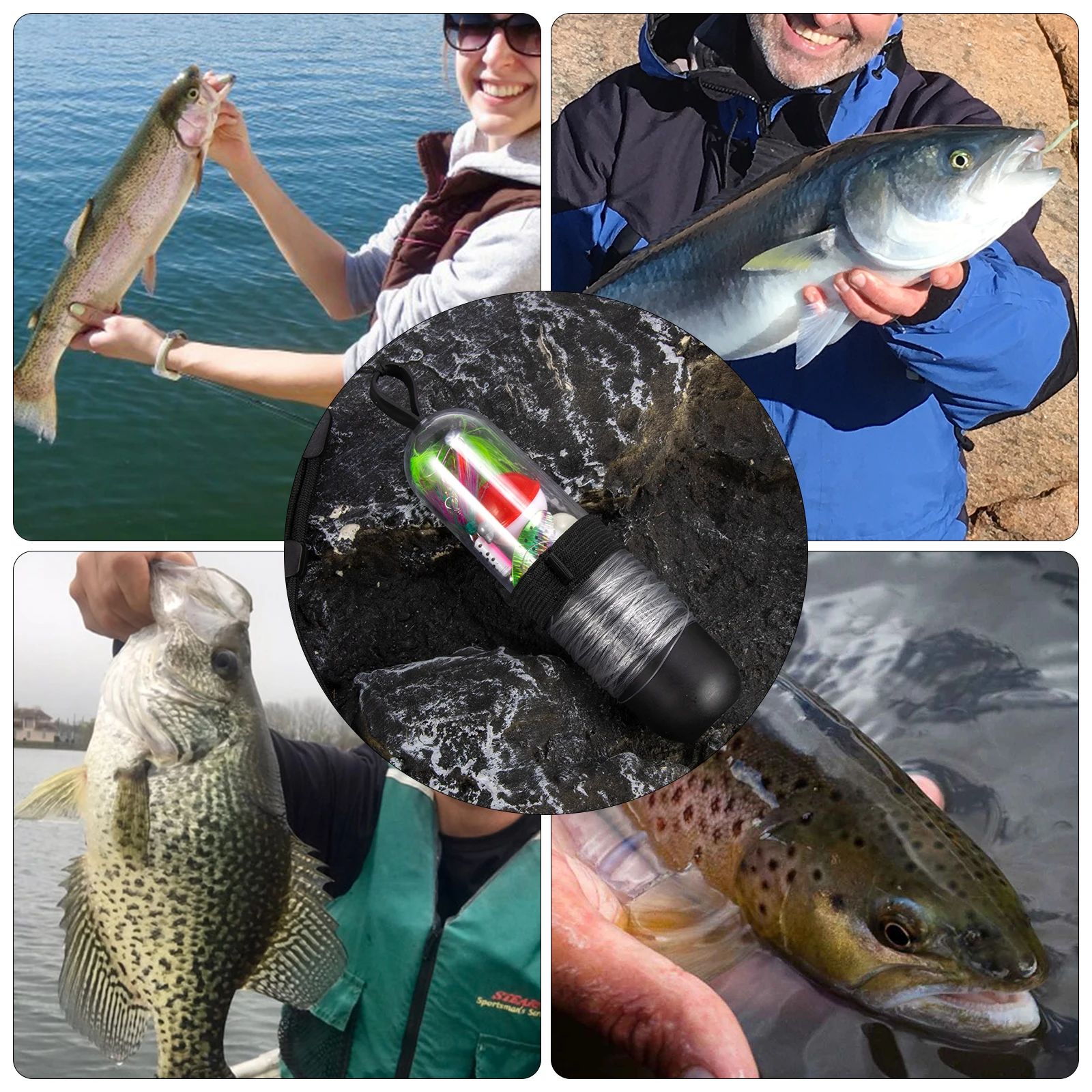 Das Survival-Angelset enthält 1 Reagenzglas, 1 schwarzes Seil, 9 Aberdeen-Haken, 6 Split-Shot-Senker, 100 m 12-Pfund-Angelschnur, 1 Schwimmer, 1 Doppelrasseln-Perle, 1 Crappie-Jig, 1 Inline-Spinner-Köder, 1 Angellöffel und 2 Spulenriemen.