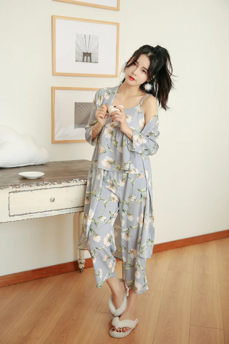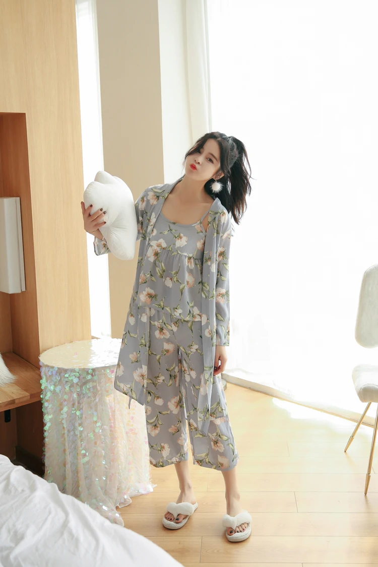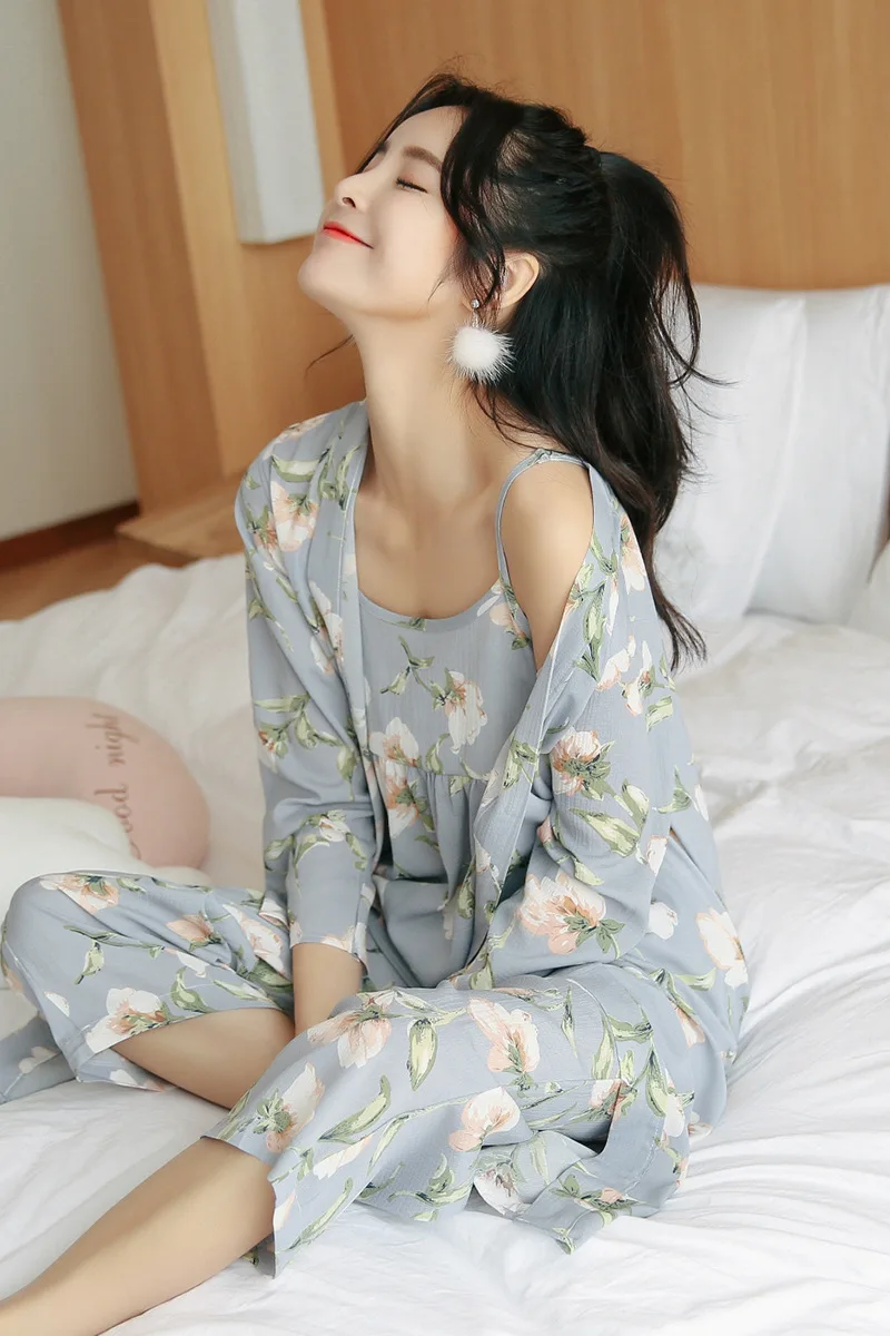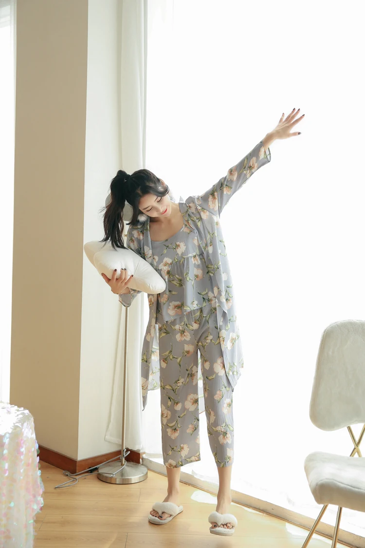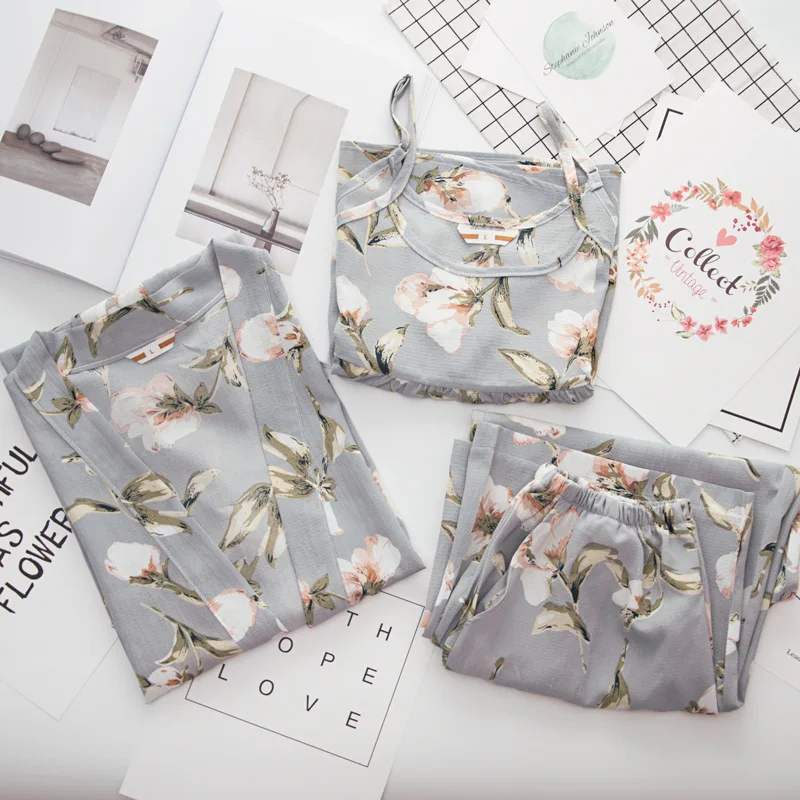 3 Pieces Women Japan Kimono Pajamas Cotton Sleepwear Pijama Soft Home Clothing Floral Printing Sleep Lounge Pyjama Pyjamas Set