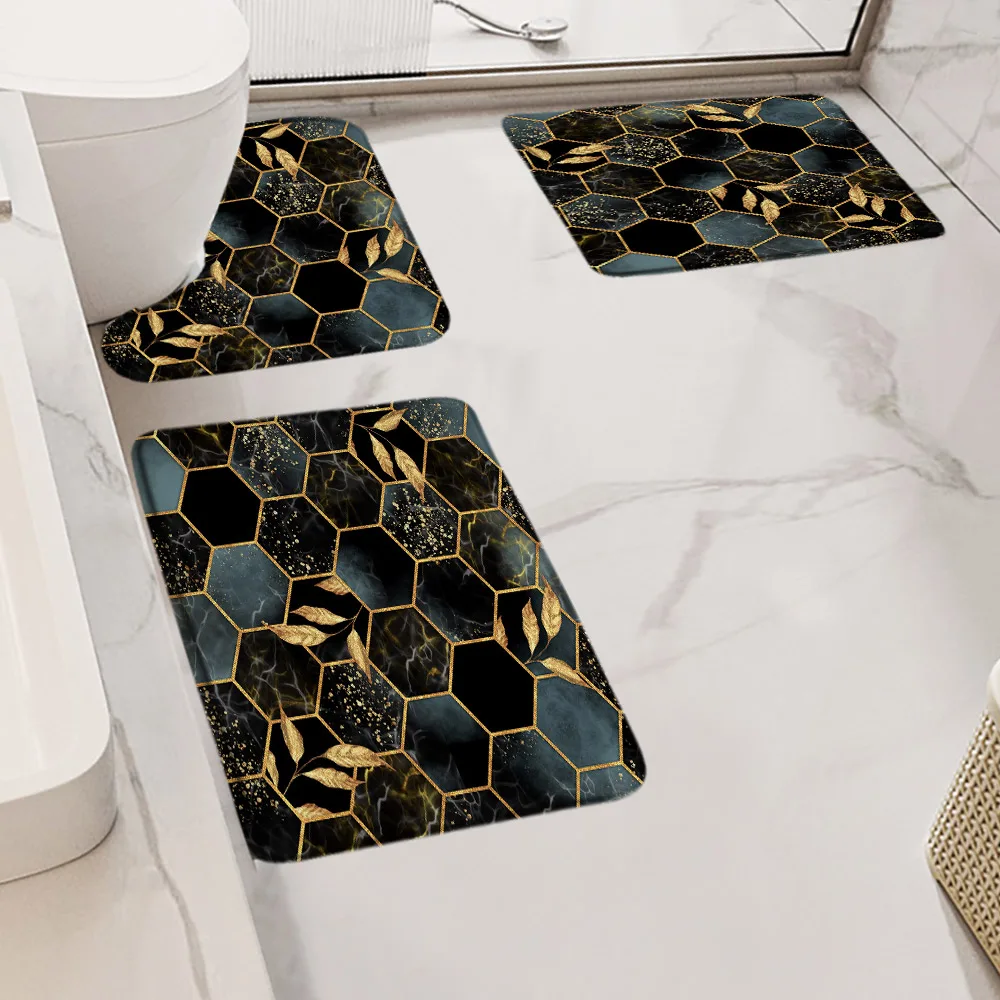 Badematten-Set mit abstraktem grauem Marmor und goldenem Strukturmuster, moderner Bodenteppich für das Badezimmer, dekorative rutschfeste Teppiche in U-Form