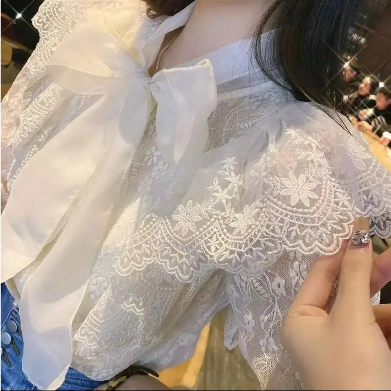 Blouses Women Scarf Collar Long Sleeve Elegant Chiffon Tops Bow Lace Fairy