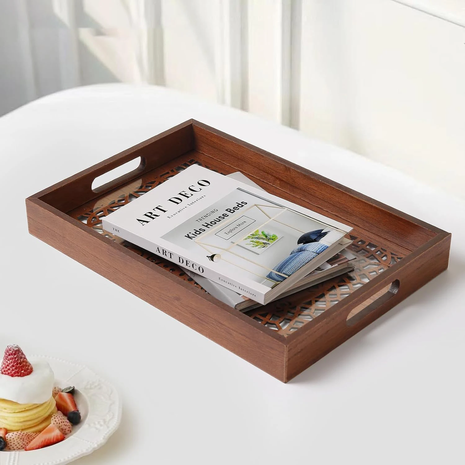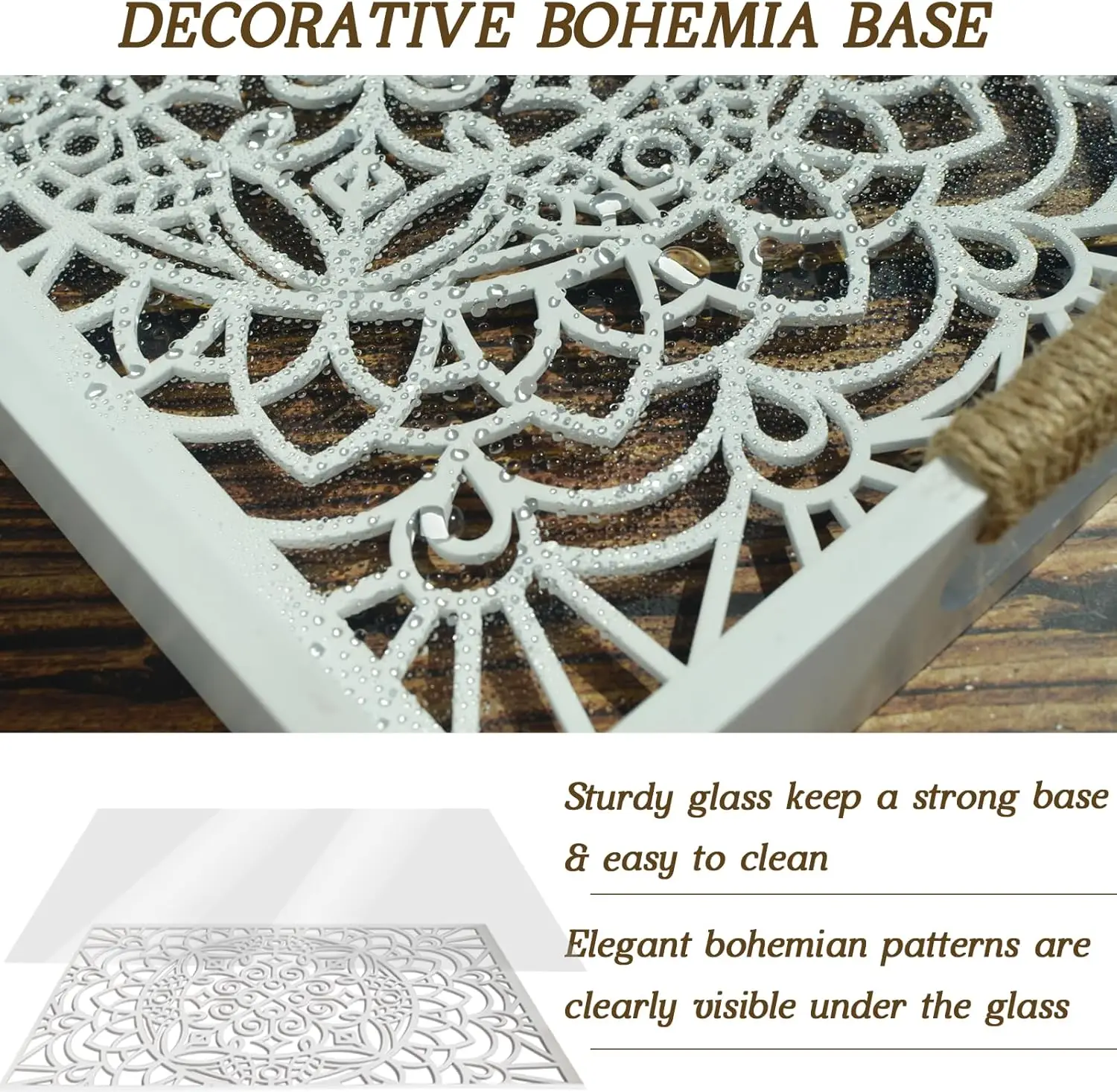 STURDY & ARTISTIC: This tray is made by high-density wood keeps it sturdy enough to serve for your guestes. The design at the bottom with a bohemian style hollowed pattern makes the wood tray full of artistic aesthetics. The clear glass on the bottom not only brings a nice vision and makes the tray sturdier.