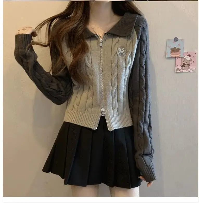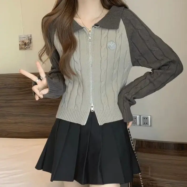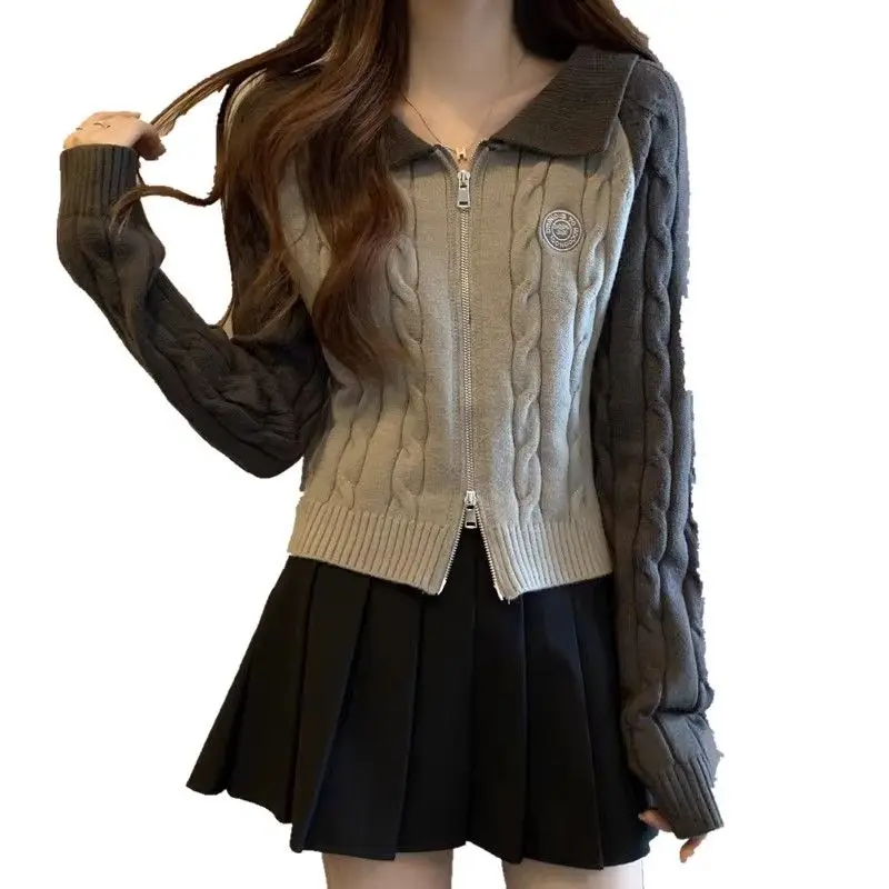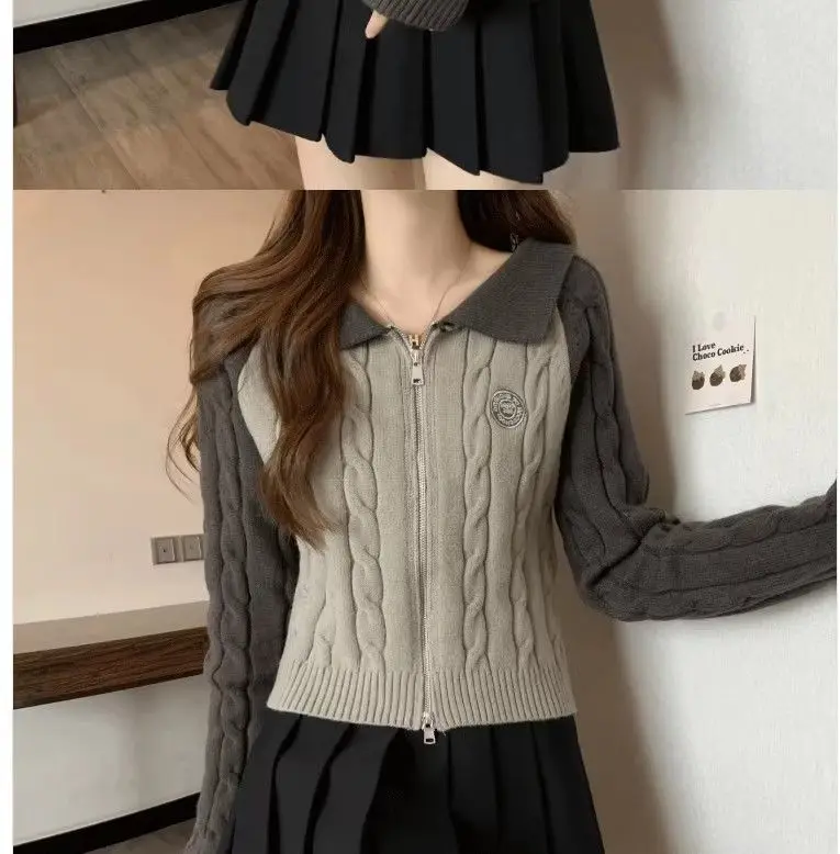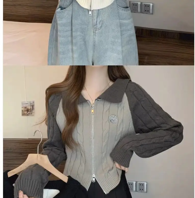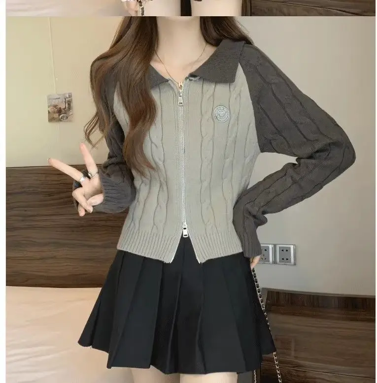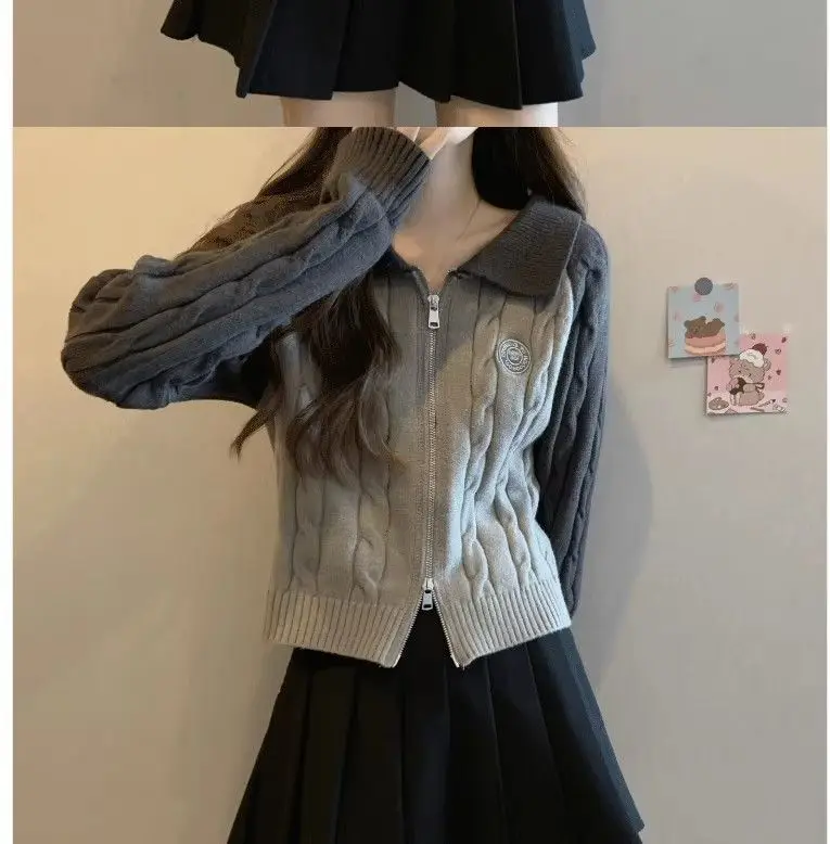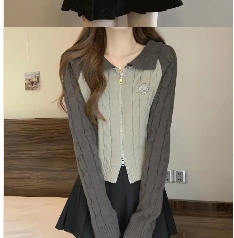 Color Blocking Design Knitted Sweater Women's Short Base Sweater Double Zipper Sweater Cardigan Top