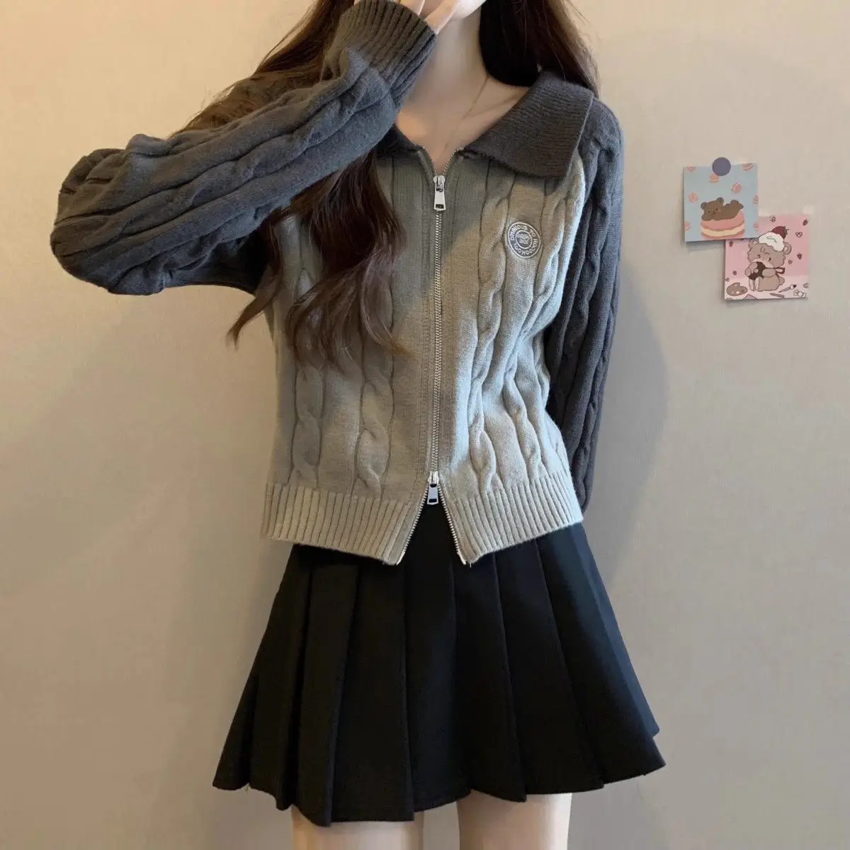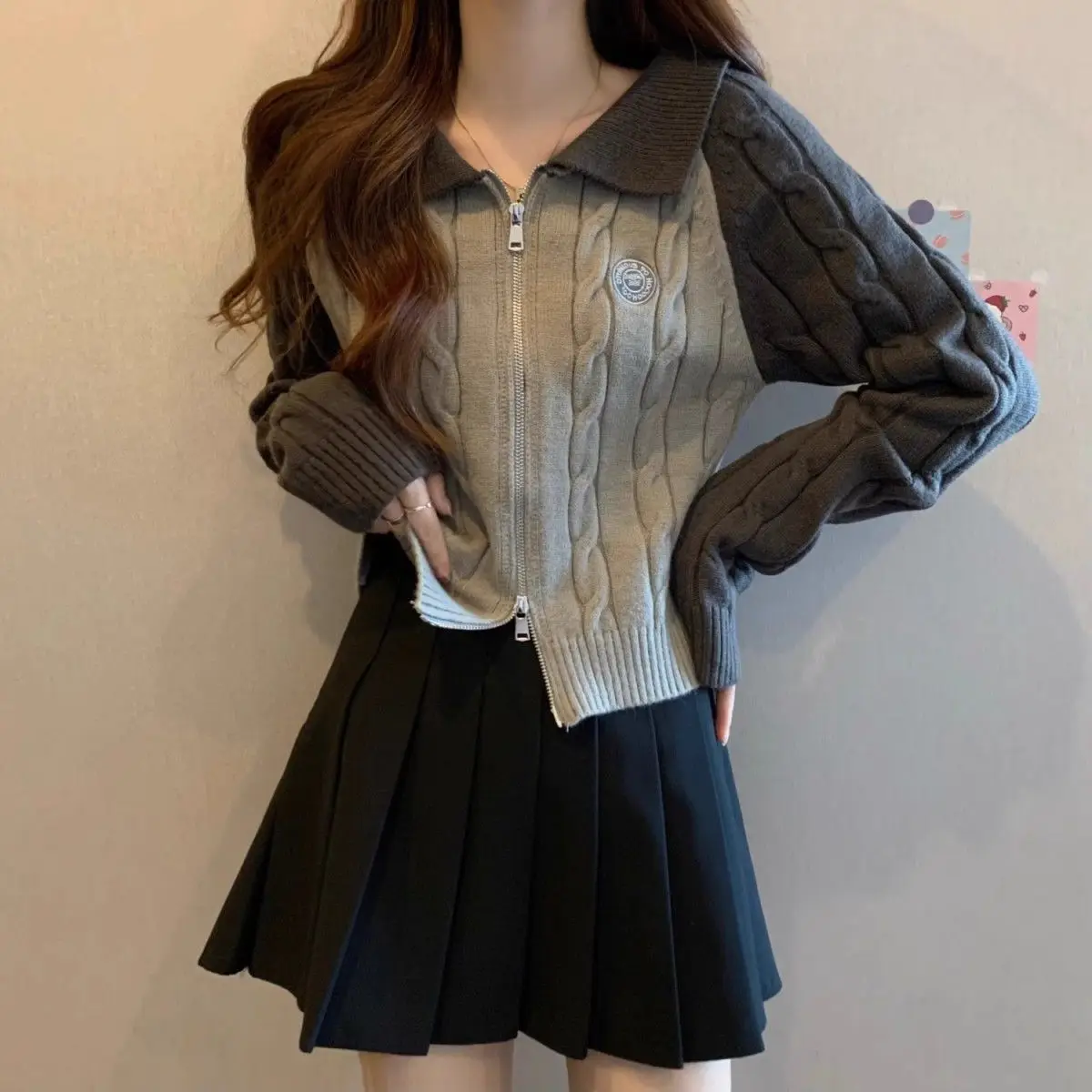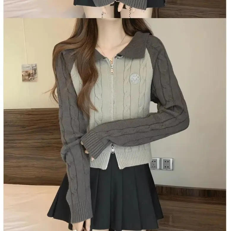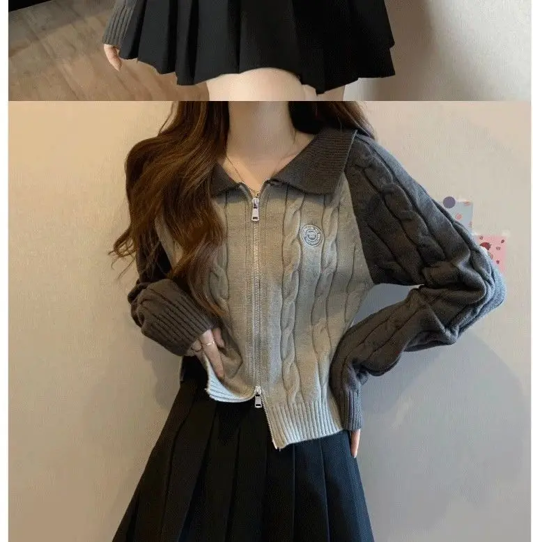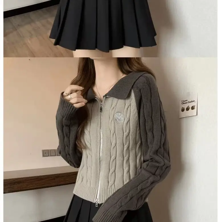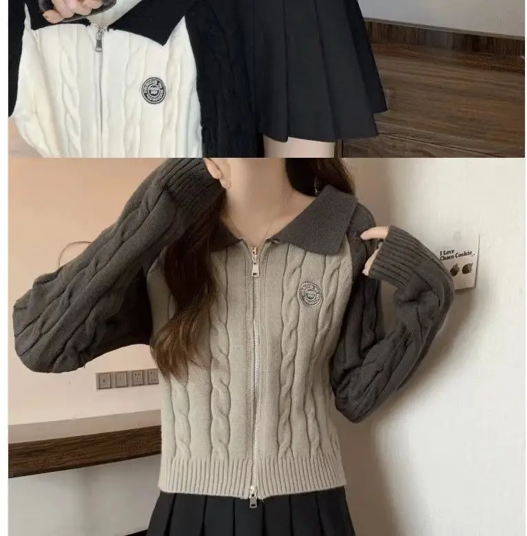 Color Blocking Design Knitted Sweater Women's Short Base Sweater Double Zipper Sweater Cardigan Top