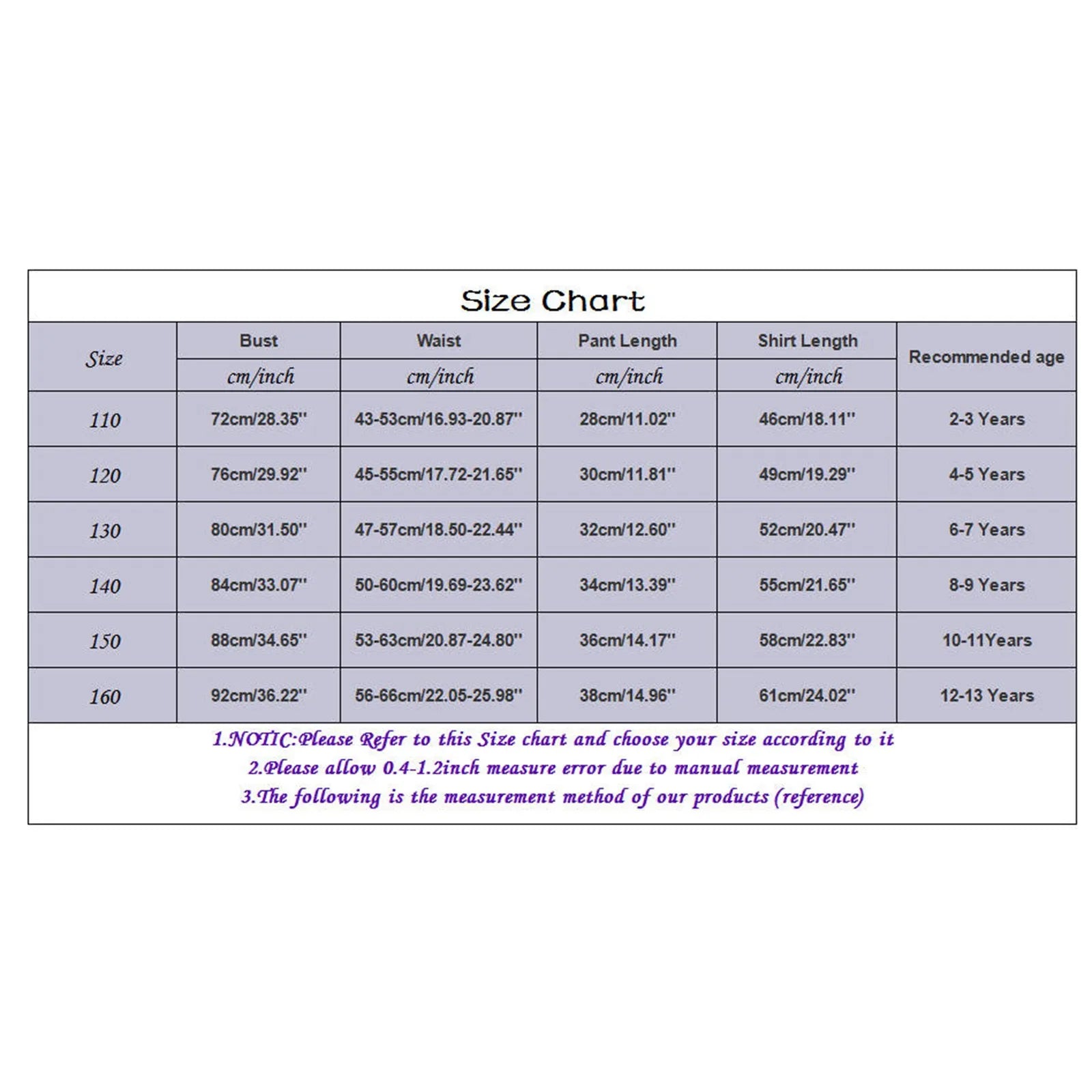 | Size:140 | Bust:84cm/33.07'' | Waist:50-60cm/19.69-23.62'' | Pant Length:34cm/13.39'' | Shirt Length:55cm/21.65'' | Recommended age:8-9 Years |