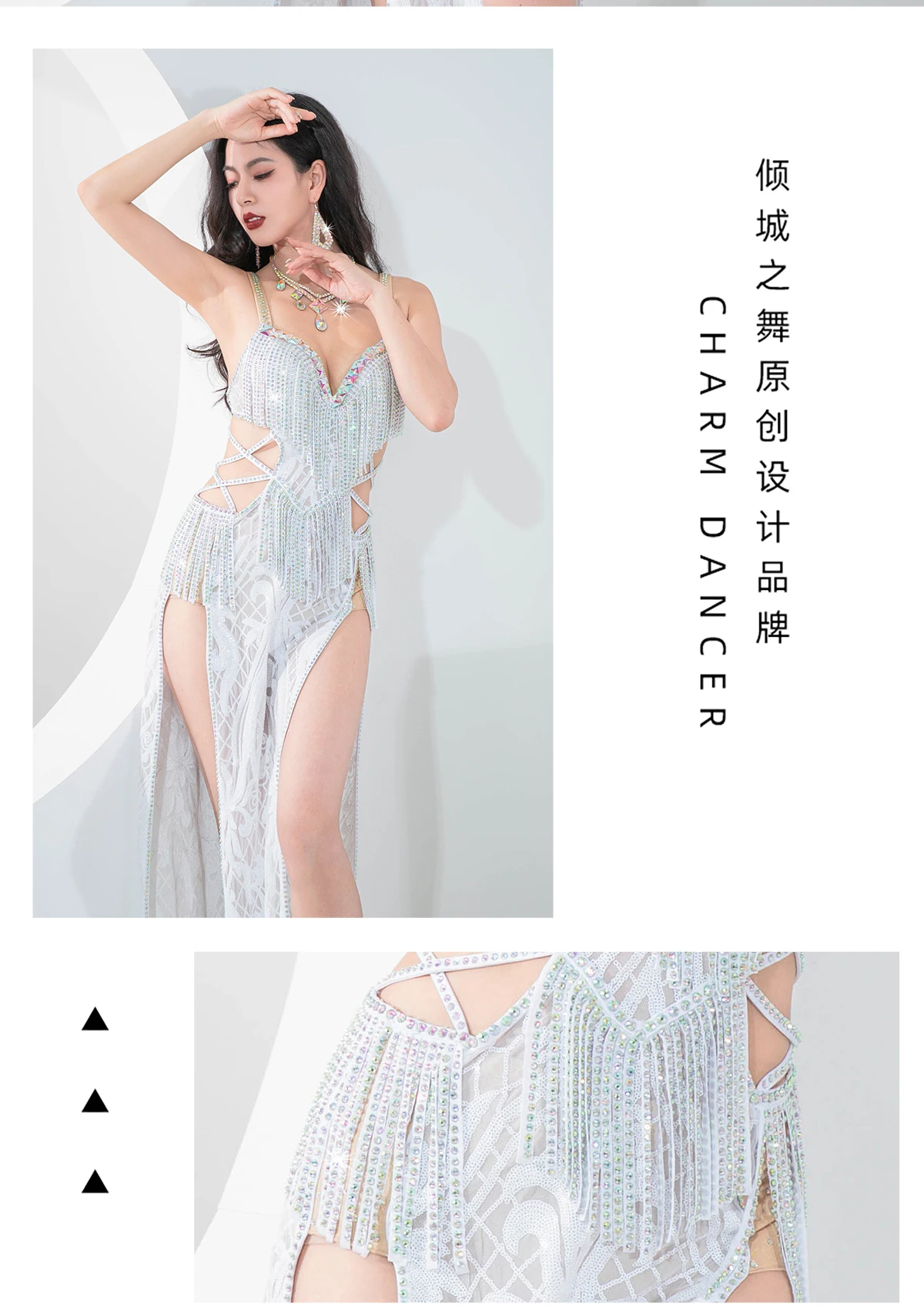This Egyptian Baladi dress with diamonds accent is adornedwith AB crystals, beading, rhinestones, and beaded fringe. A great timeless costume that adds elegance and style to every step. Bra is designed on a hard cup with padding. Dress features a front open panel and sewn-in shorts. this costume is sure to captivate your audience with its timeless beauty. Perfect for competitions and performances.