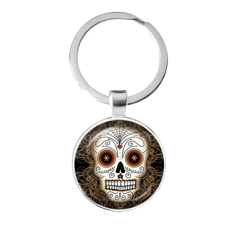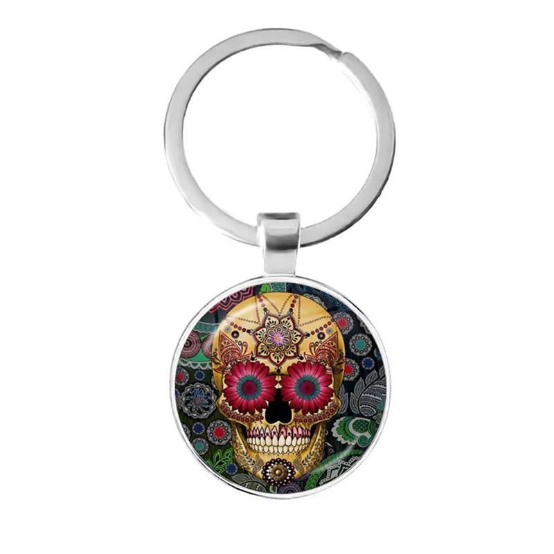 Fashion Colorful Sugar Skull Keychain Mexico Folk Art Patterns Glass Pendant Key Chain Jewelry Holiday Gift