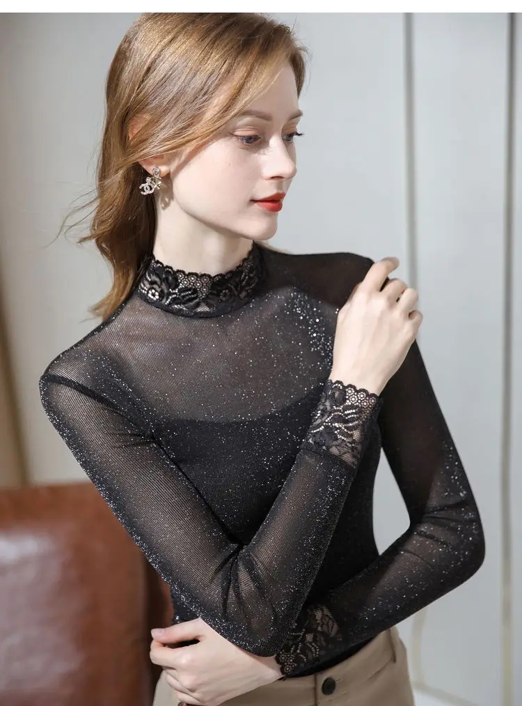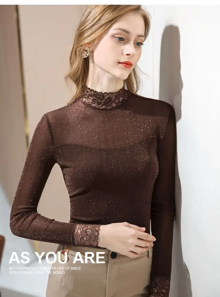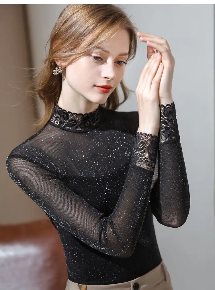 Fashion Gauze Bright silk Spliced Lace Blouses Women's Clothing 2023 Autumn winter Elegant pullovers Office Lady Shirts