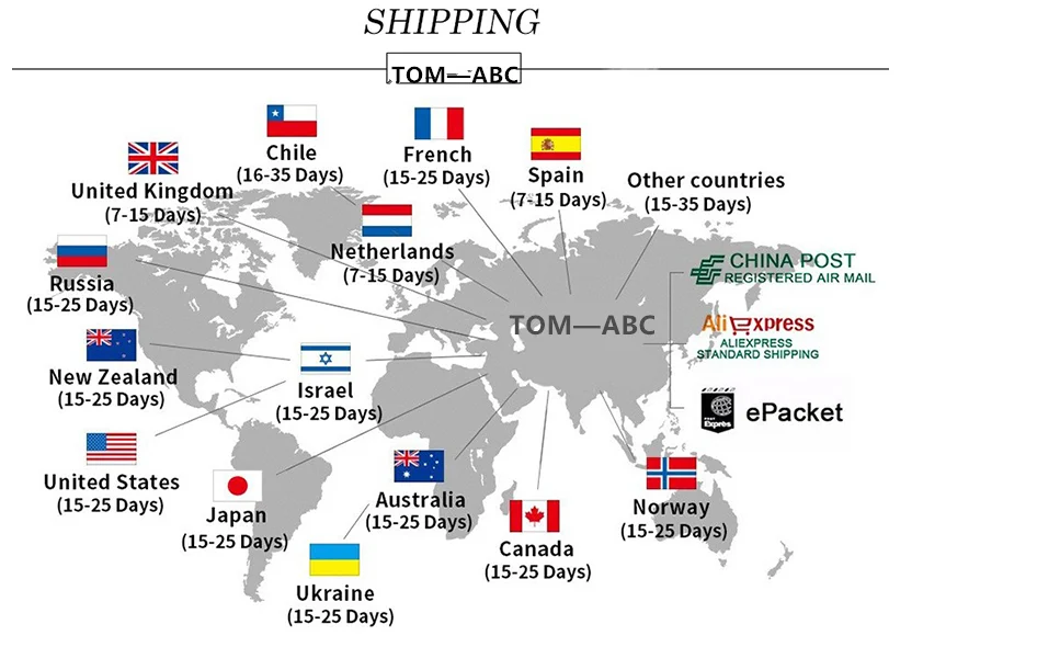 2.In normal,we suggest you choose by AliExpress Standard Shipping ,it's an online shipping method by Ali website provided,reach most of countries within 10 to 30 bussiness days,It's fast and safety. Delivery time depends on destination and other factors,it may take up to 60 business days.