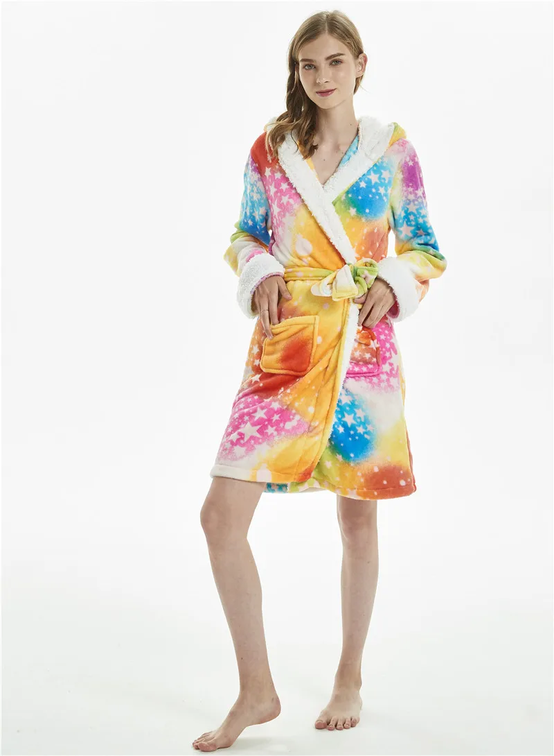 Flannel Bathrobe Starry Sky Rainbow Unicorn Sleepwear Pajamas For Adult Women Loungewear Halloween Costumes Oversized Nightgown