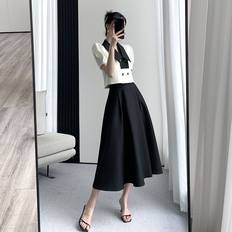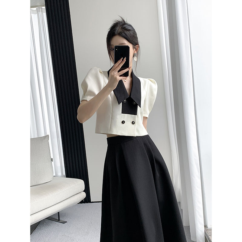 Elegantes französisches Zweiteiler-Set für Vintage-Bürodamen mit Puffärmeln, weißes bauchfreies Top + schwarzer Midirock in A-Linie, Retro-Sommeroutfit