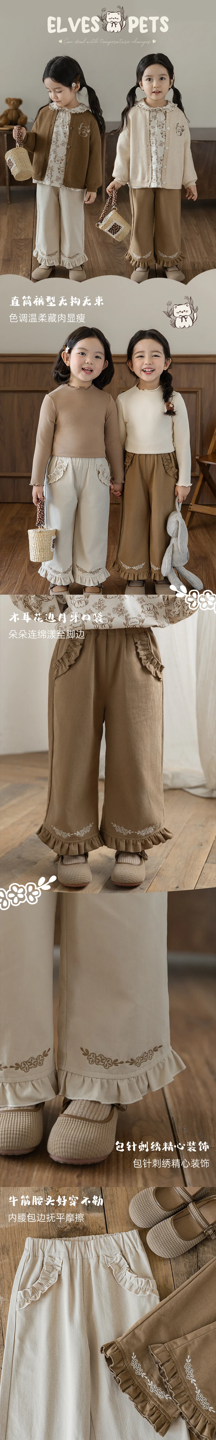 Girls' Two-color Embroidered Straight Leg Pants Autumn Playful Cute Lace Pockets Casual Pants Trendy