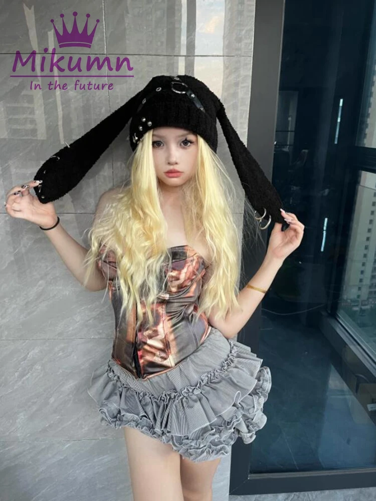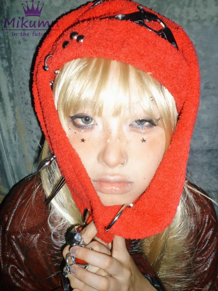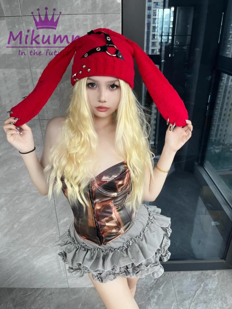 Harajuku Punk Rock Leder Ring Nieten Kaninchen Ohr Strickmützen Gothic Grunge Schwarz Rot Chic Design Frauen Winter Warme Beanie Hüte