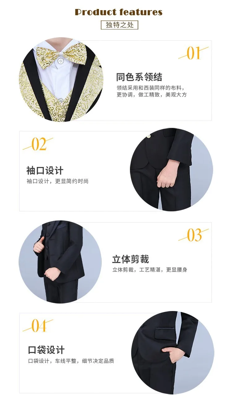 Kids Blazer 5Pieces/Set Jacket Vest Pants Shirt Bowtie Wedding Birthday Party Dress Boys Slim Fit Ceremony Photography Costume