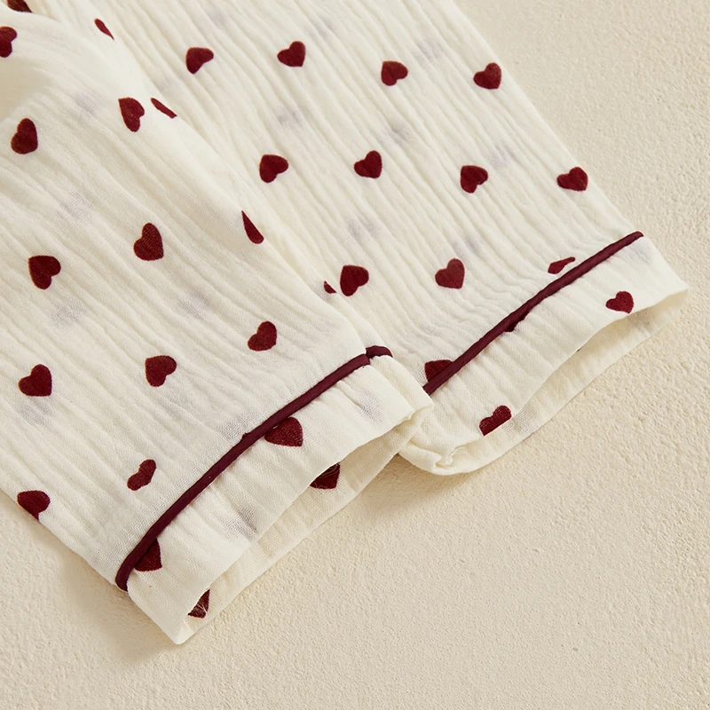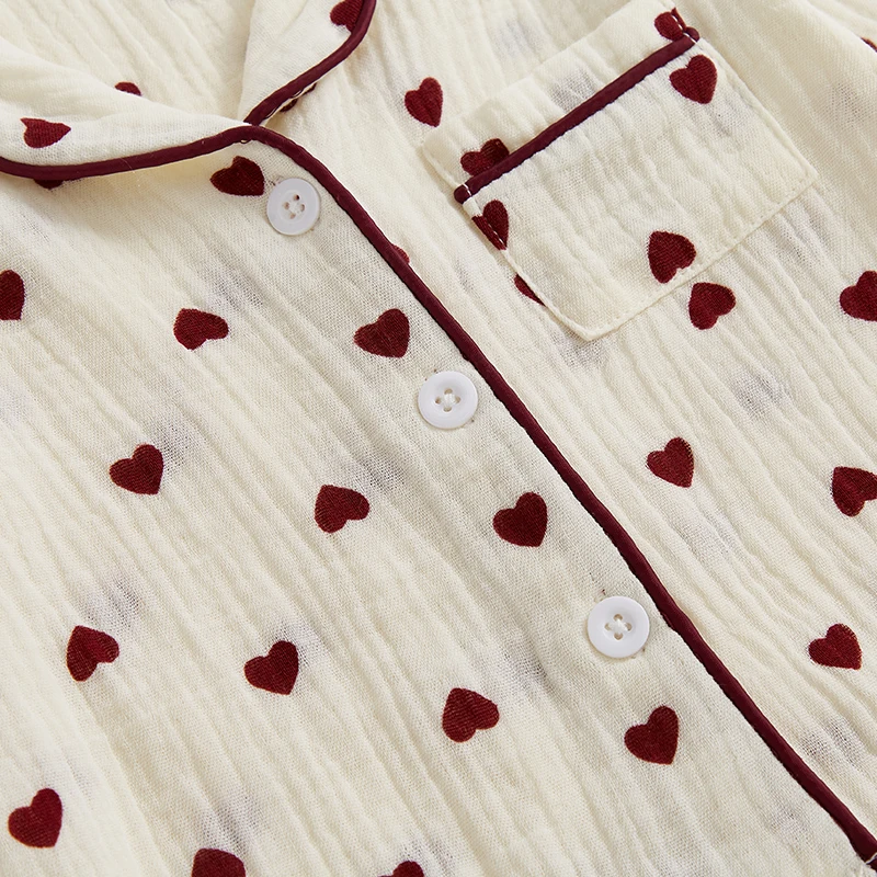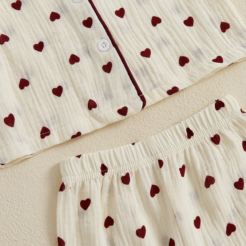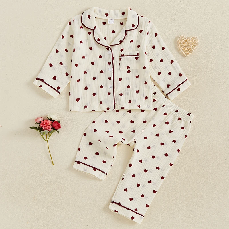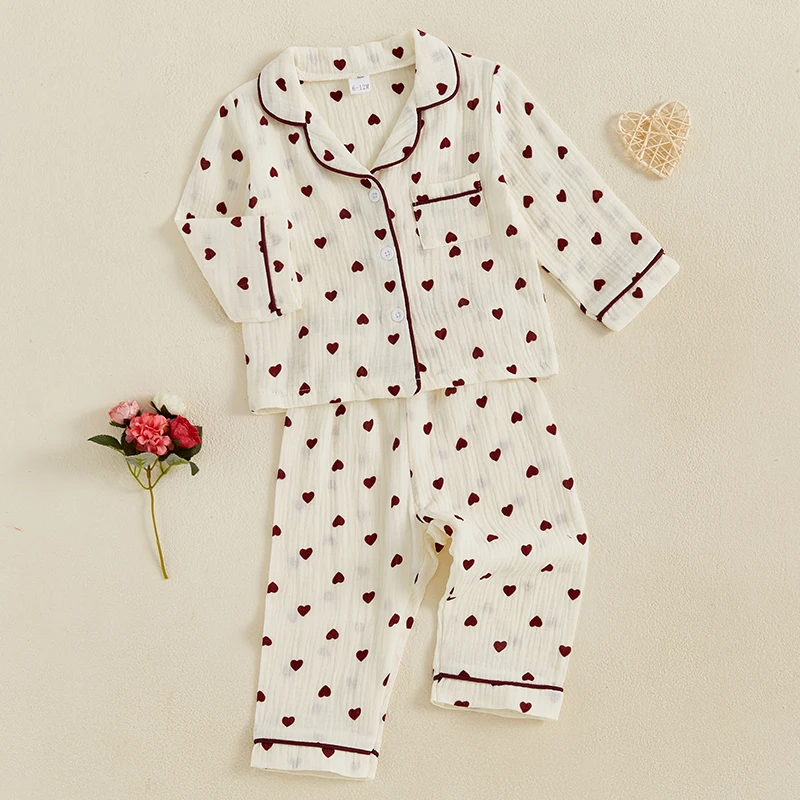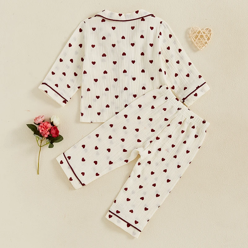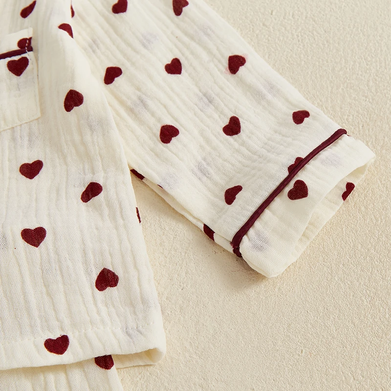 Girls Valentine's Day outfit; Toddler girls pajamas with heart print; Pajama top with one chest pocket, long sleeves, front button closure and lapel; Pajama pants with elastic waist design, easy to fit, warm and comfortable