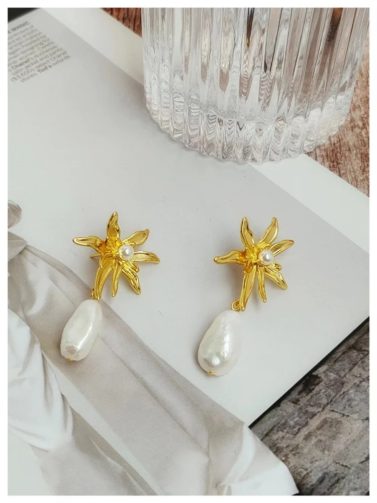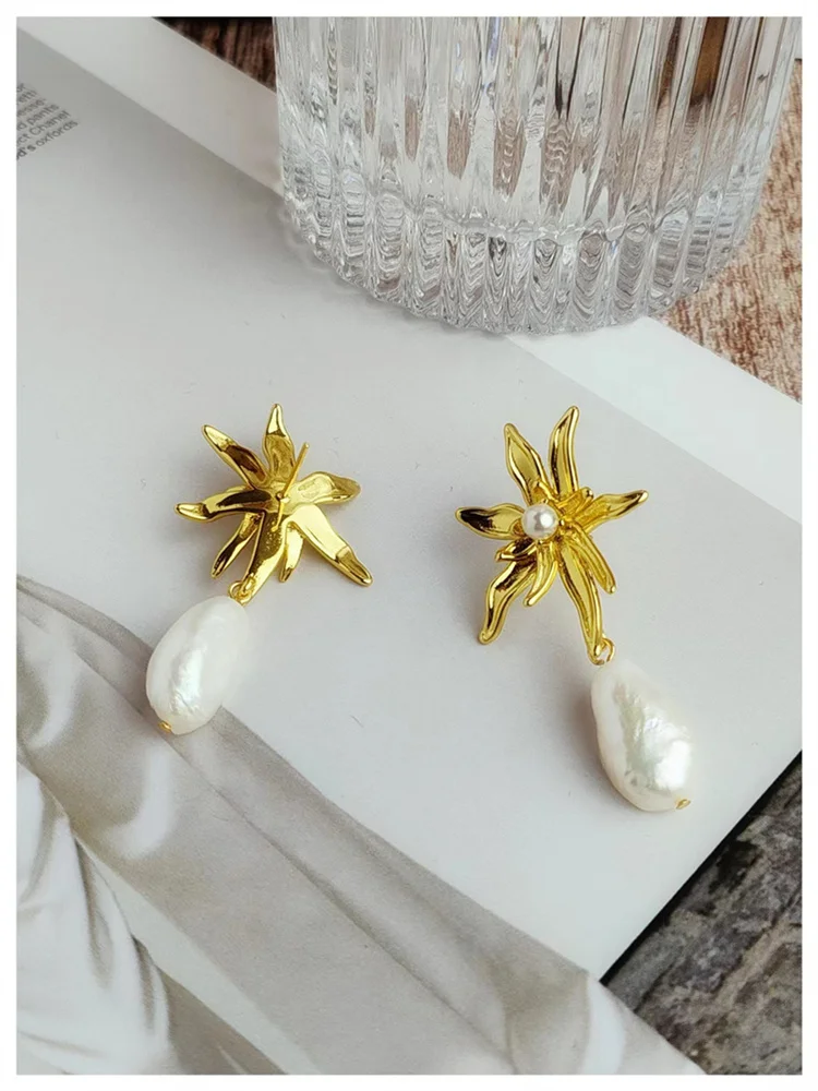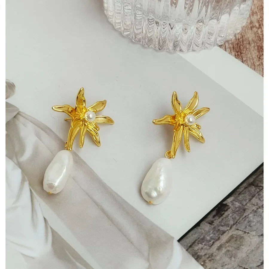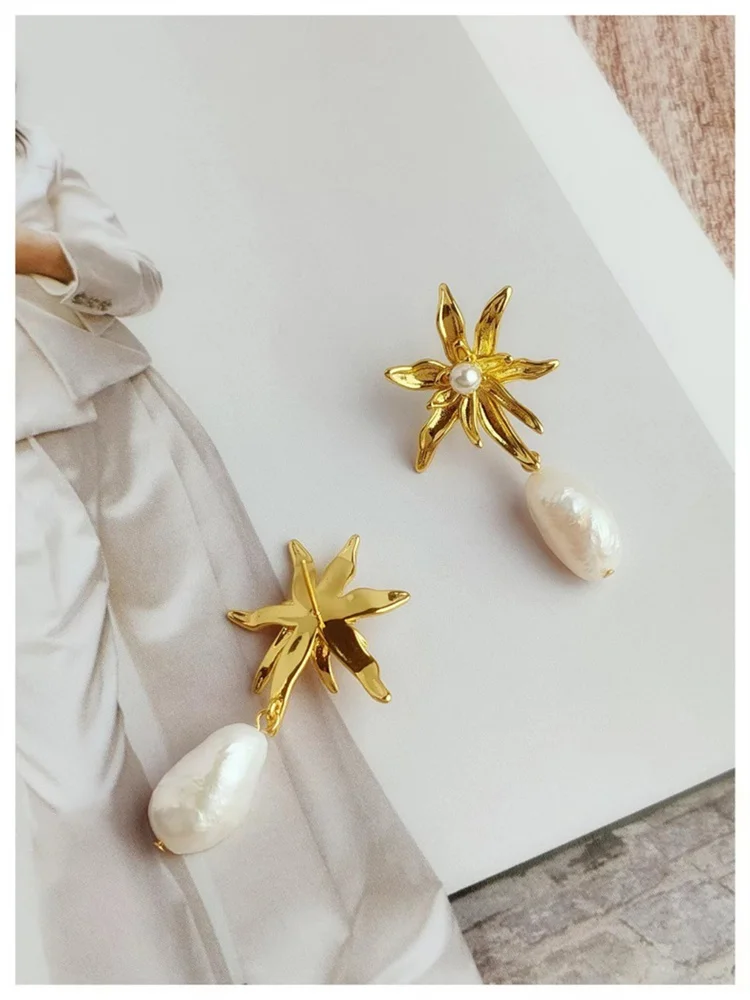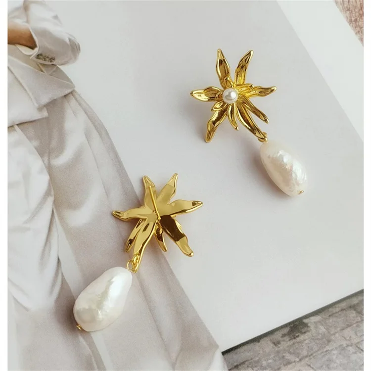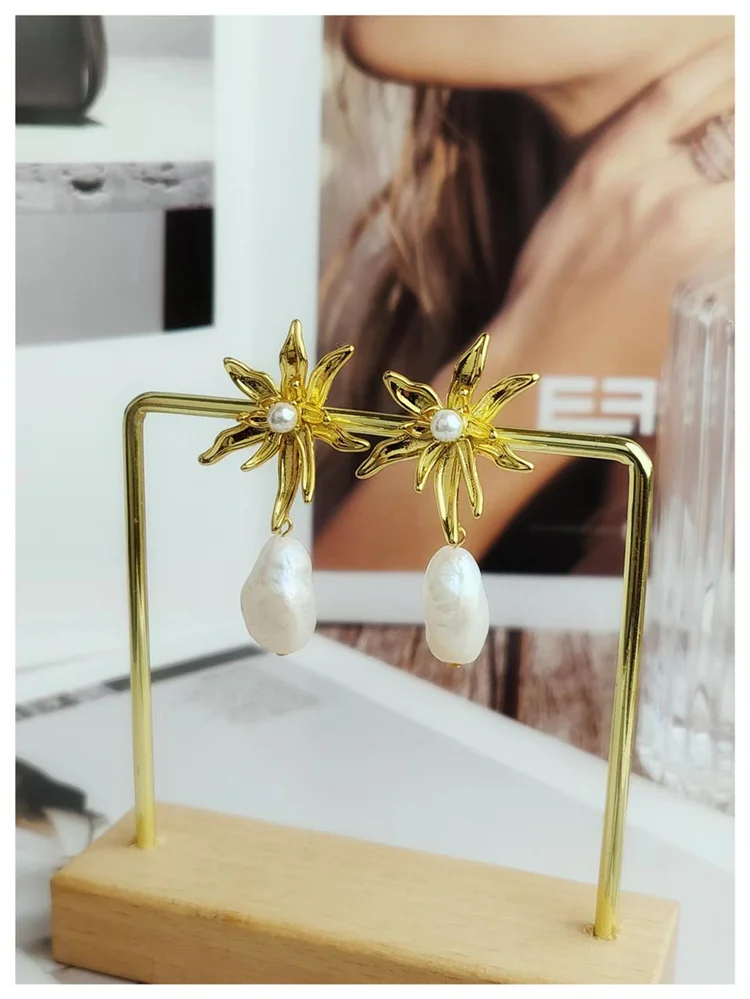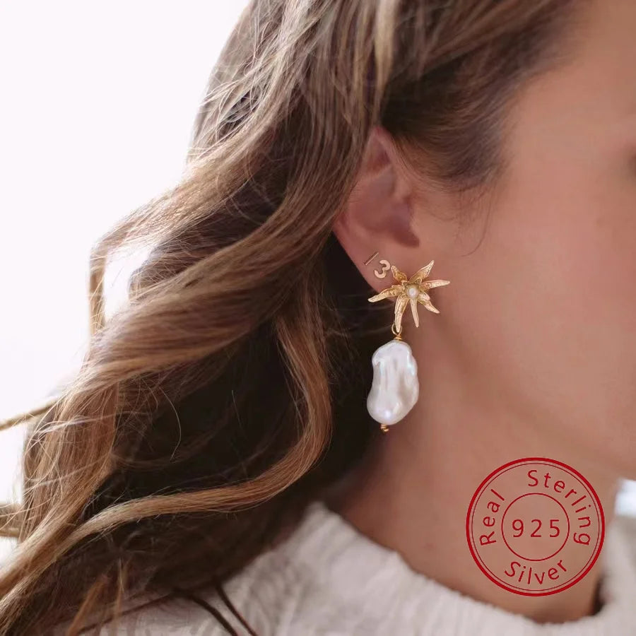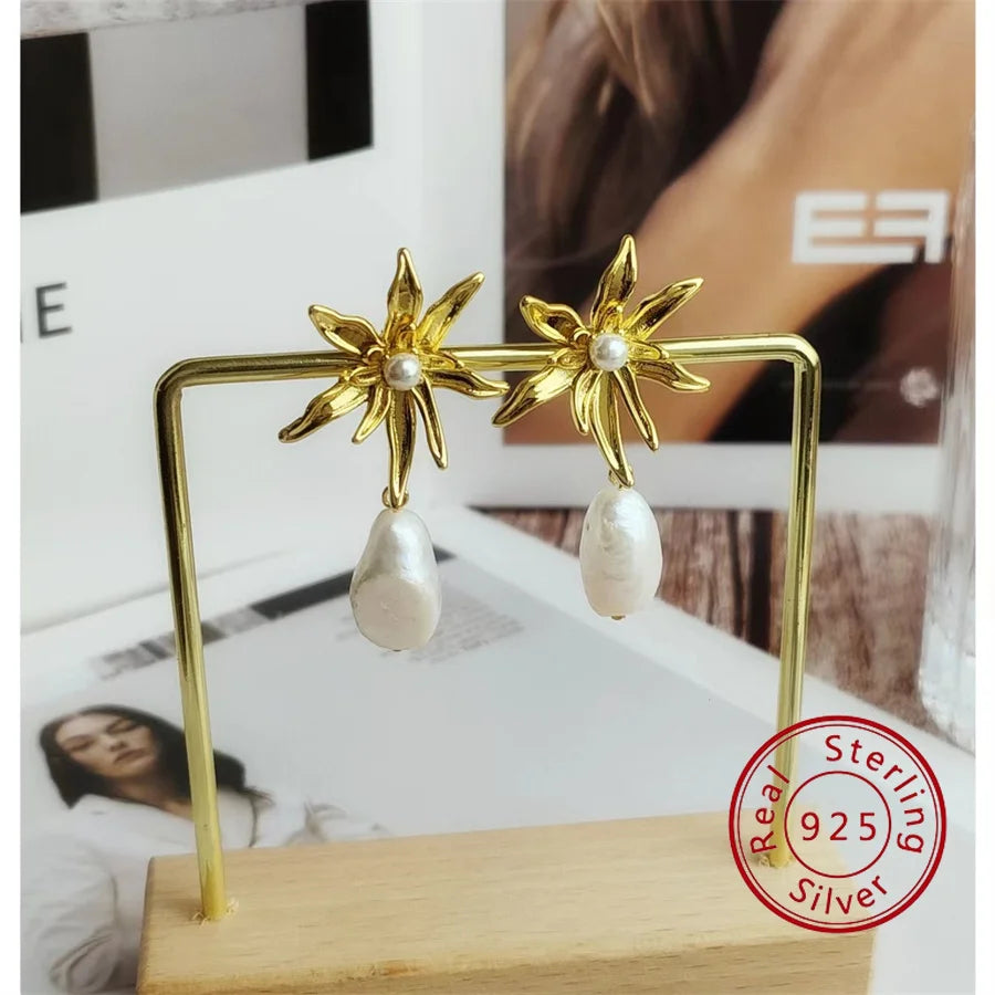 Luxury 925 Silver Needle Sunflower Baroque Pearl Dangle Earring Irregular Freshwater Pear Drop Earrings for Women Party Jewelry