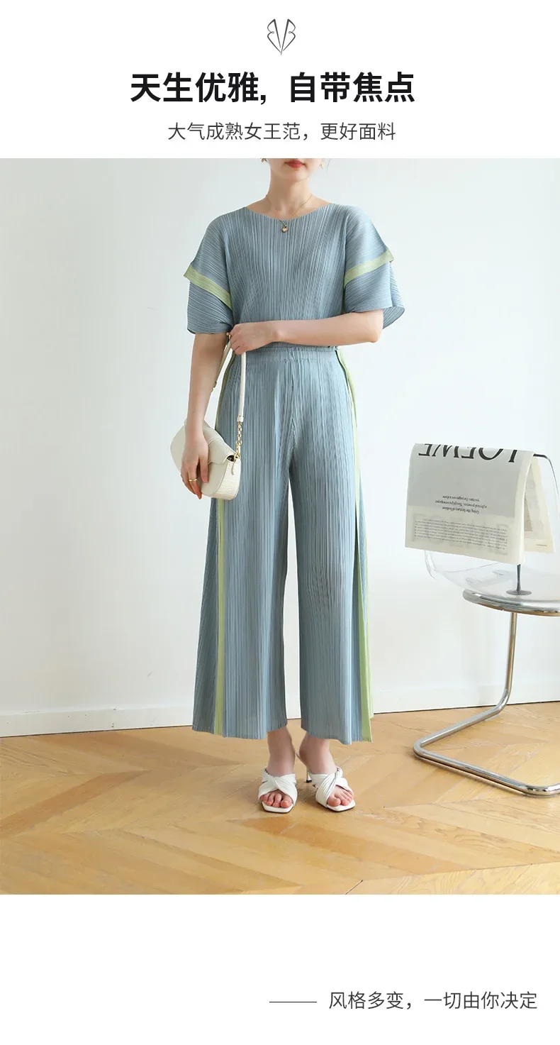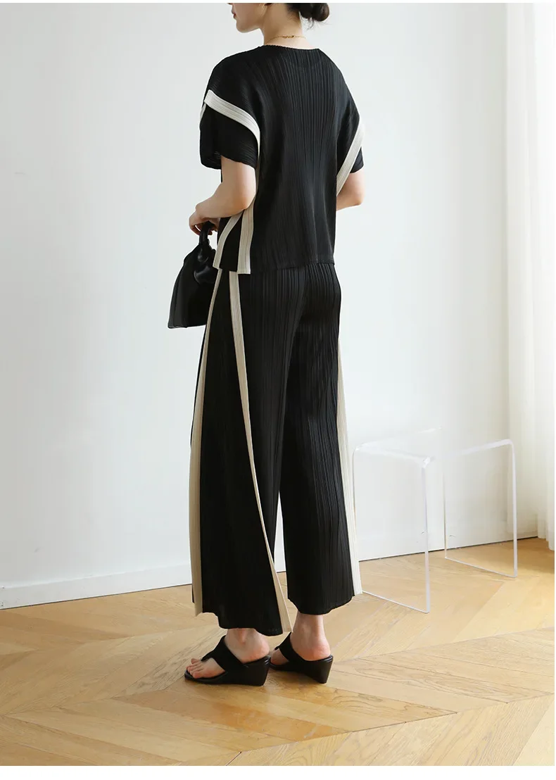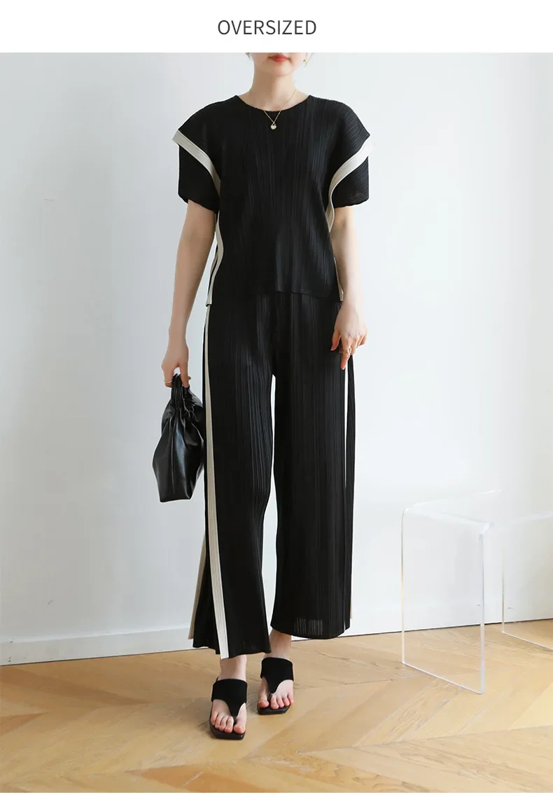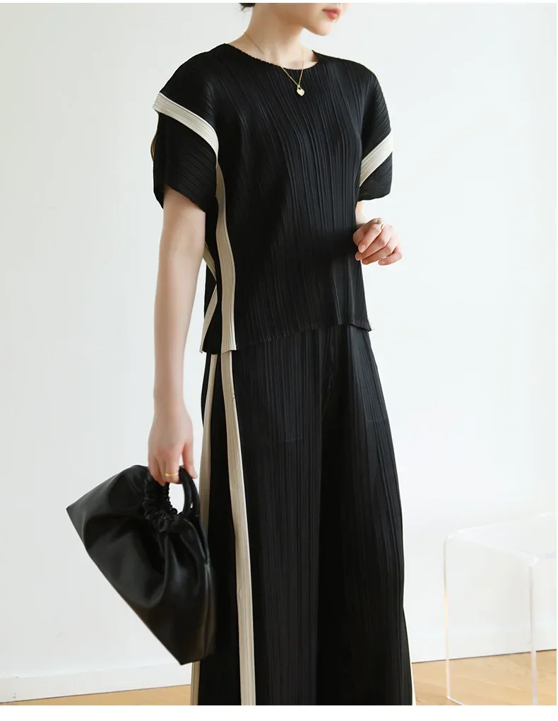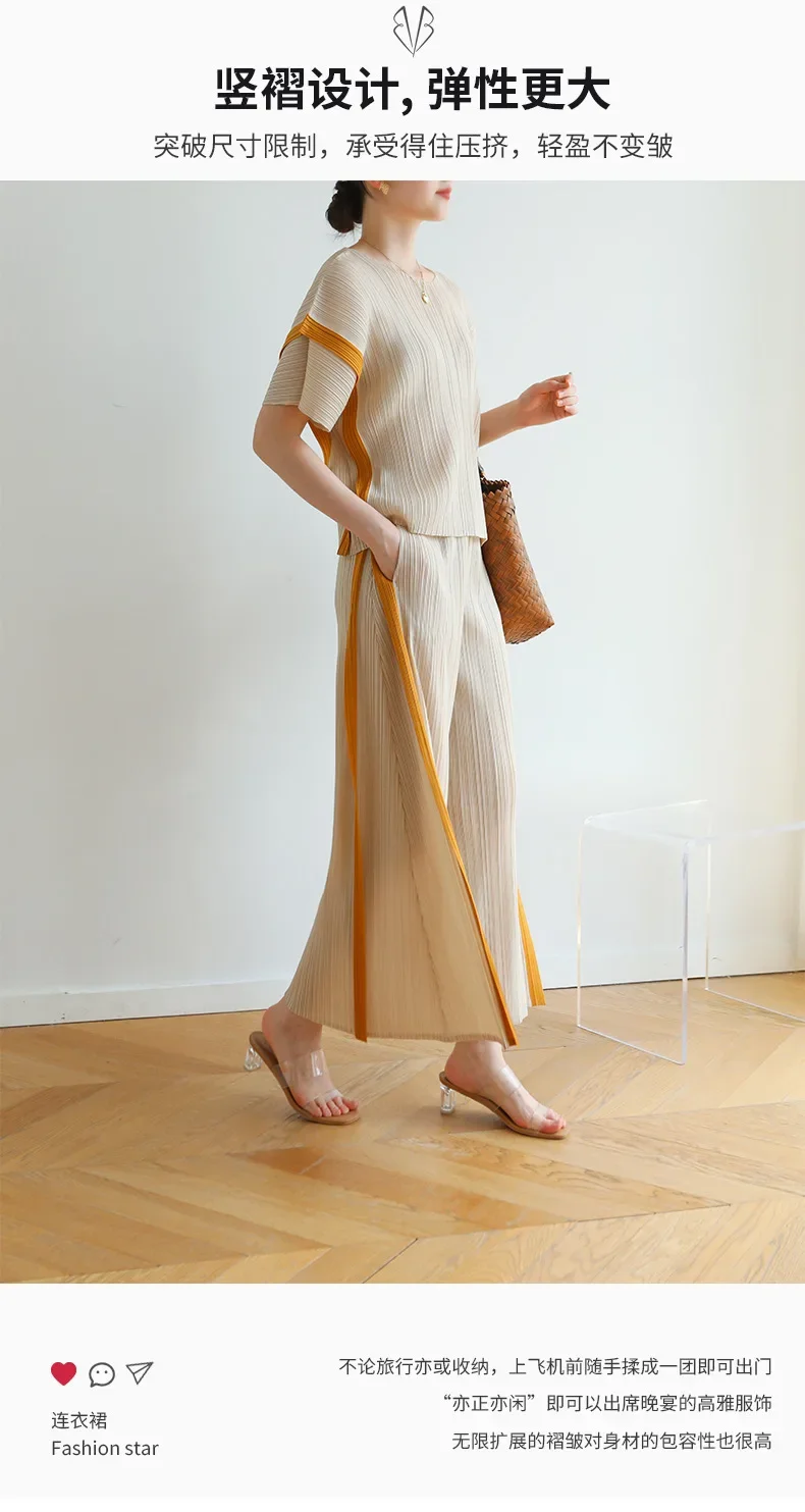 MIA XU Pleats Pants Sets 2025 Summer Miyake High-end Pleats Color Blocking False Two Pieces Fashion Casual T-shirt Pants Set