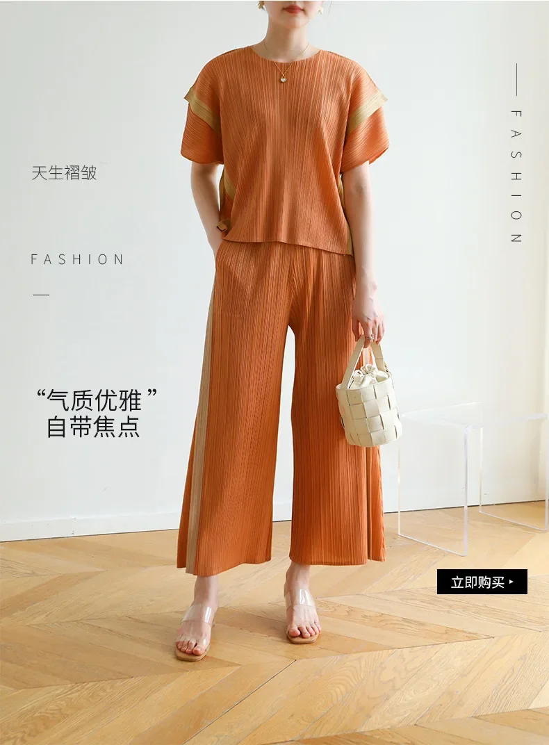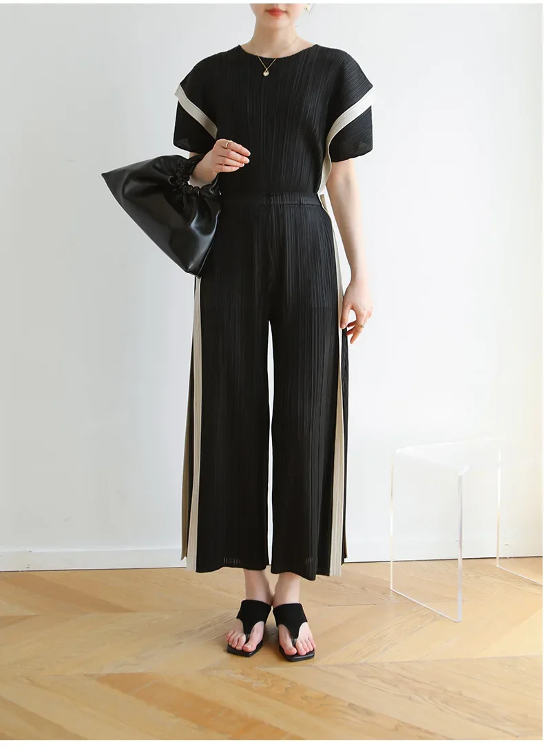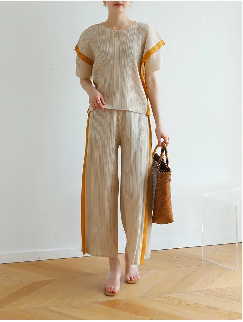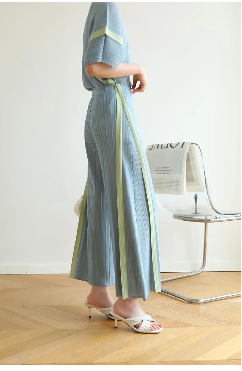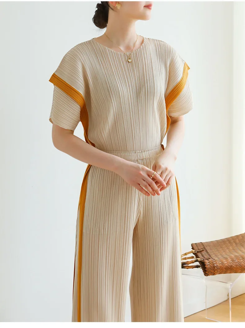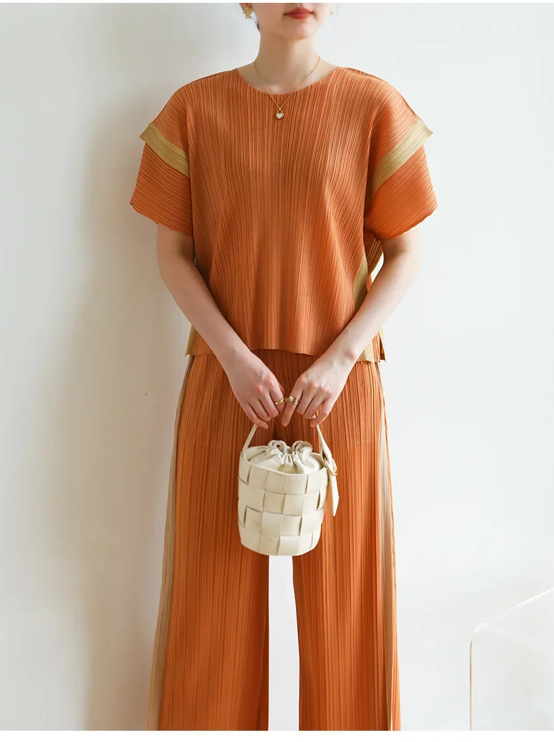 MIA XU Pleats Pants Sets 2025 Summer Miyake High-end Pleats Color Blocking False Two Pieces Fashion Casual T-shirt Pants Set