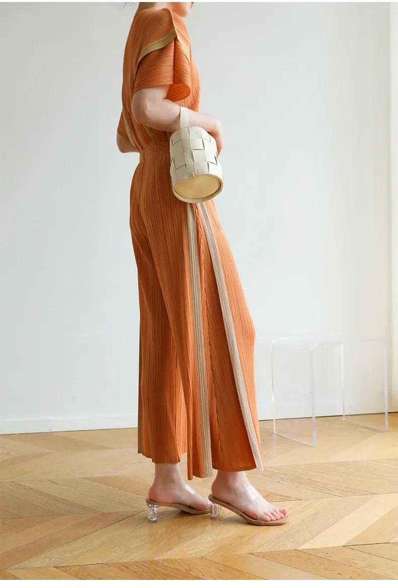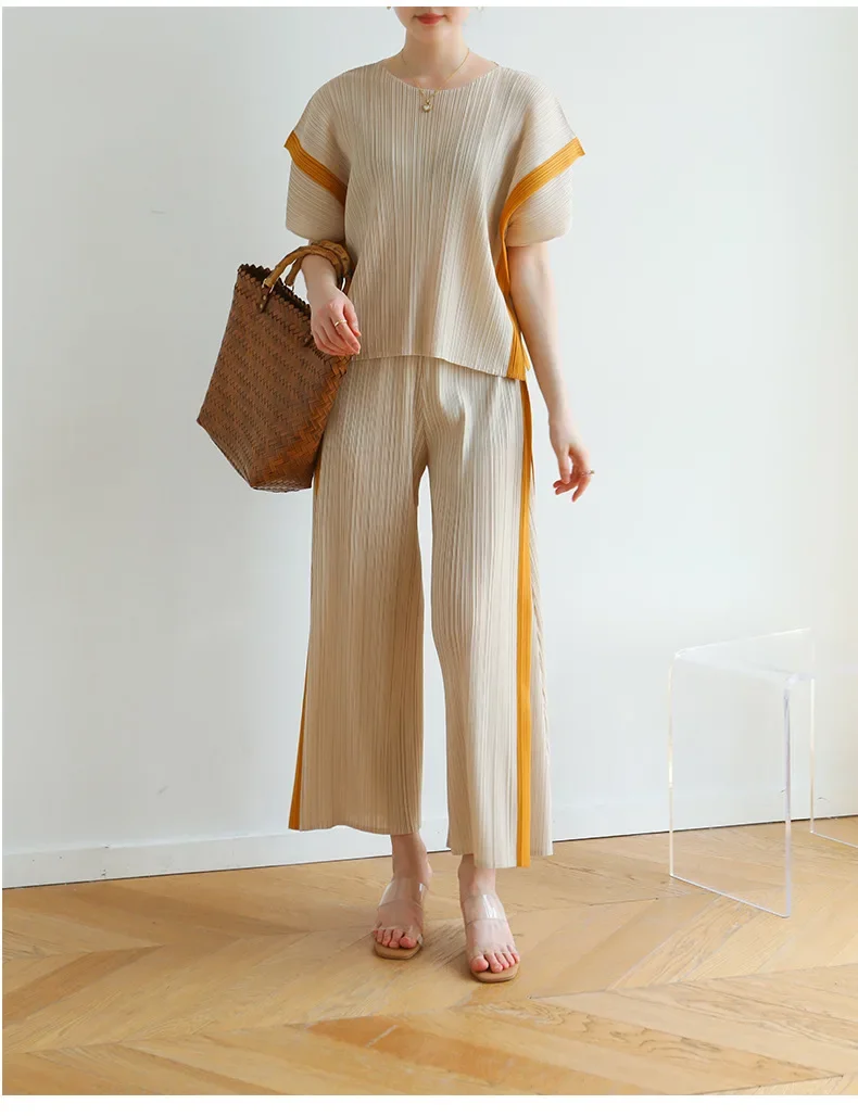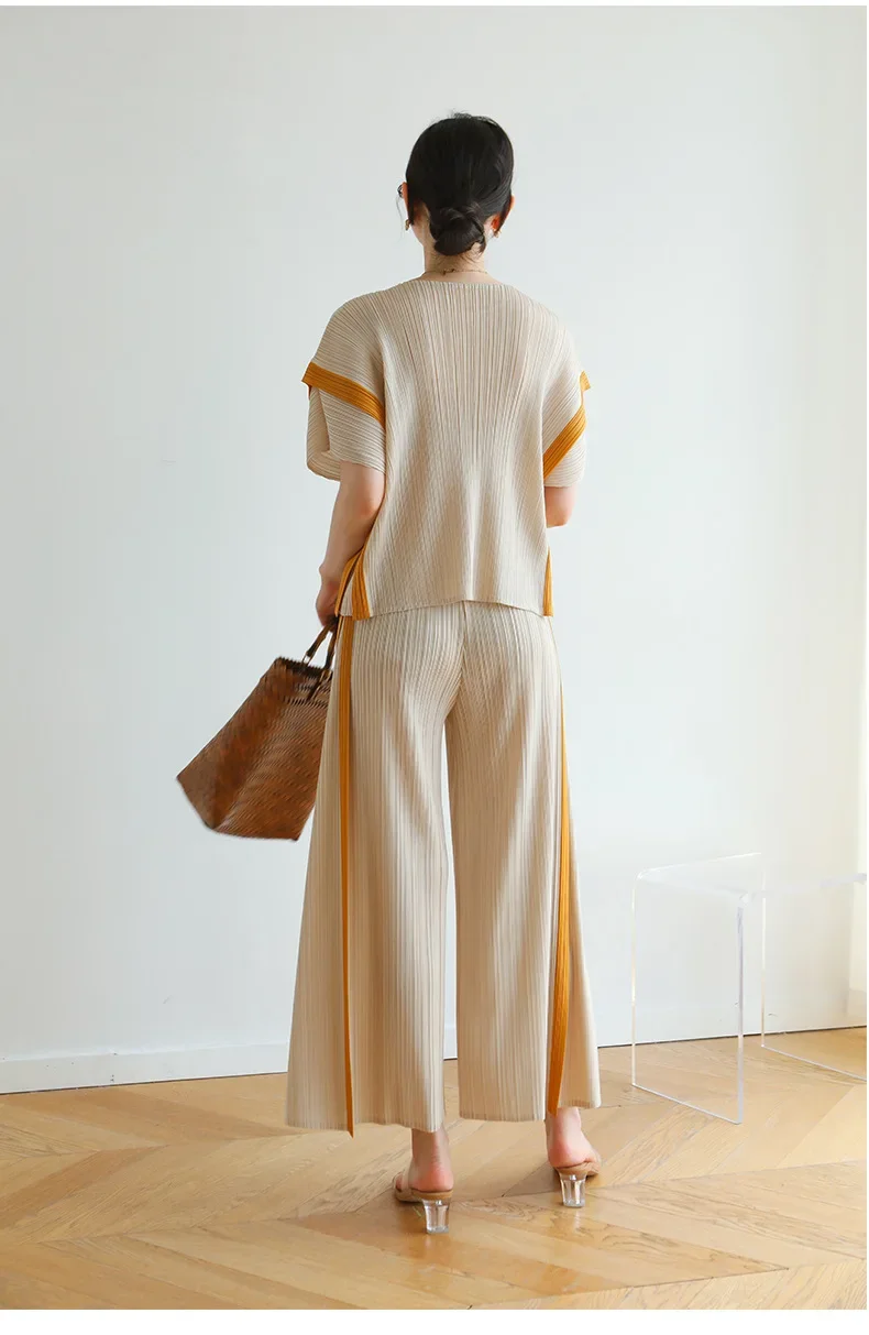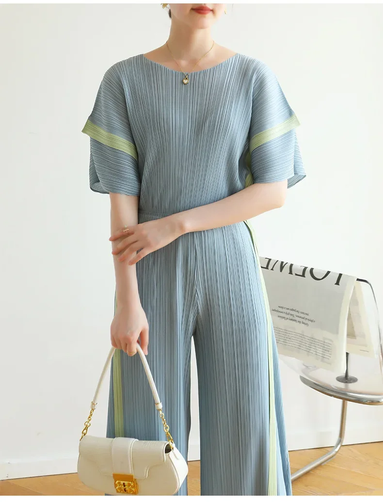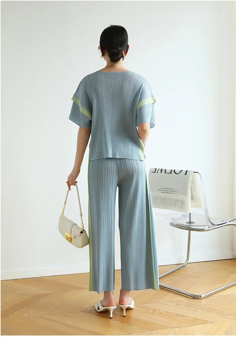 MIA XU Pleats Pants Sets 2025 Summer Miyake High-end Pleats Color Blocking False Two Pieces Fashion Casual T-shirt Pants Set