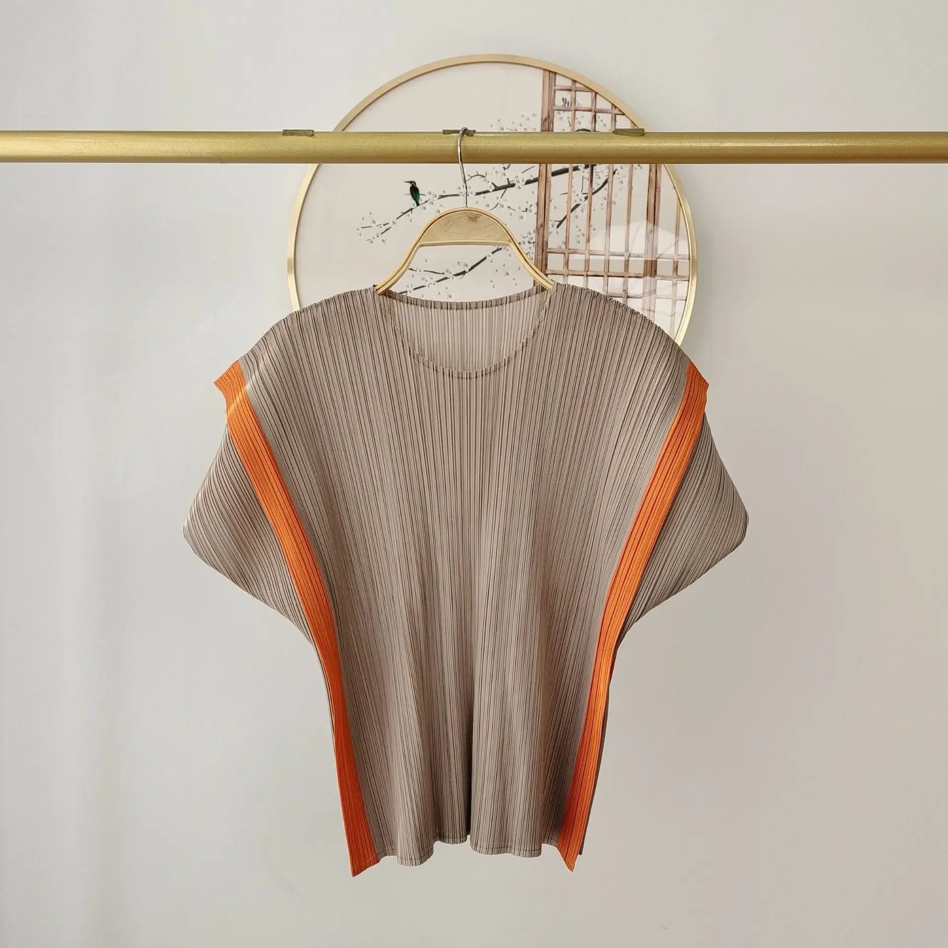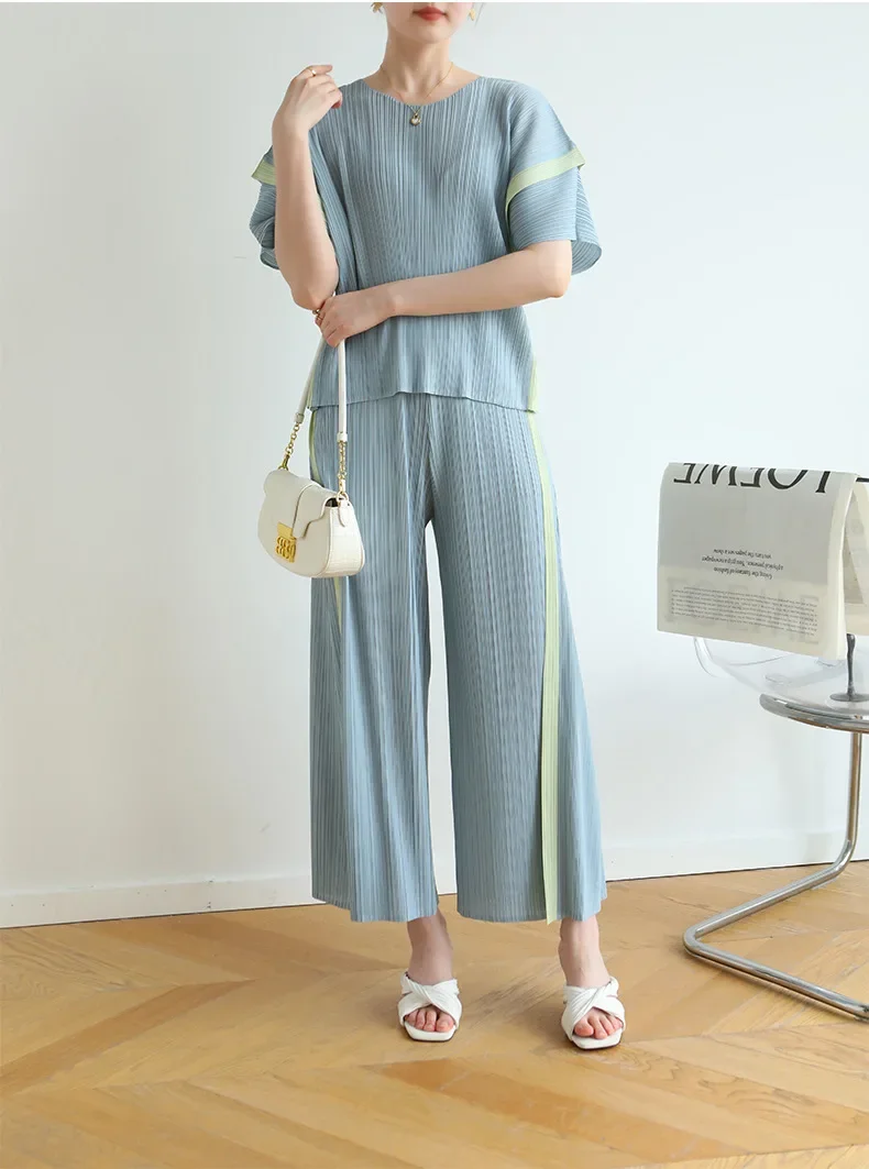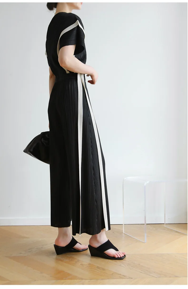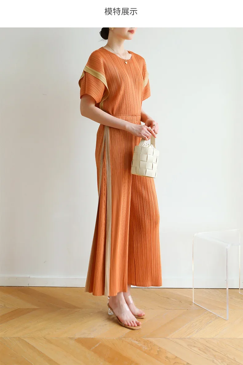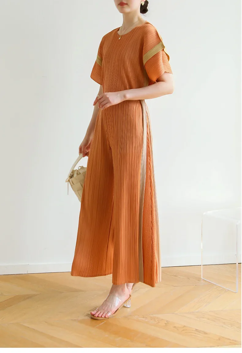 MIA XU Pleats Pants Sets 2025 Summer Miyake High-end Pleats Color Blocking False Two Pieces Fashion Casual T-shirt Pants Set